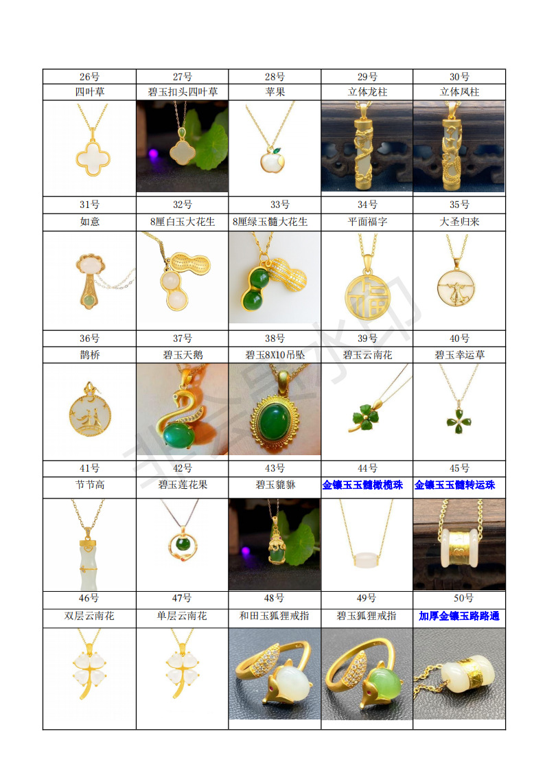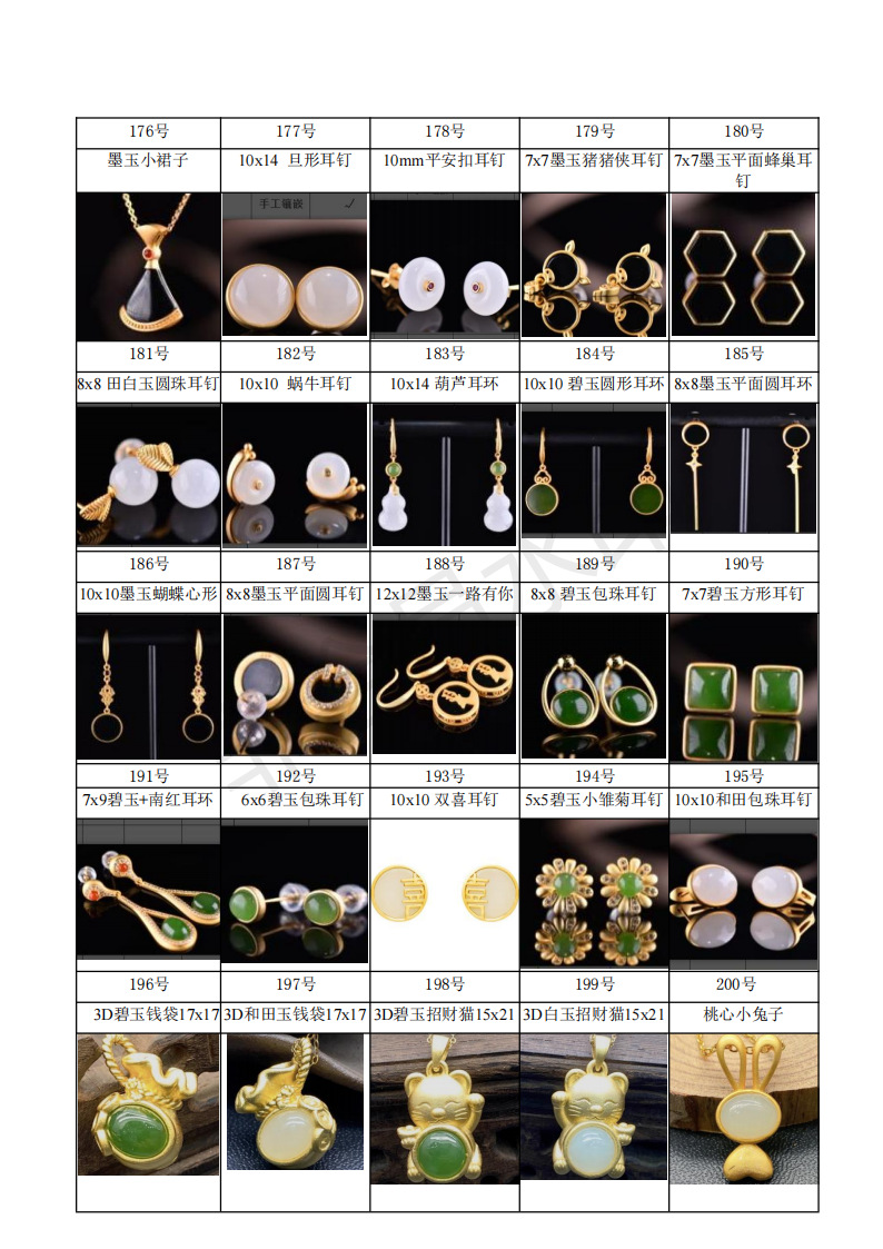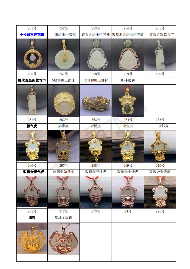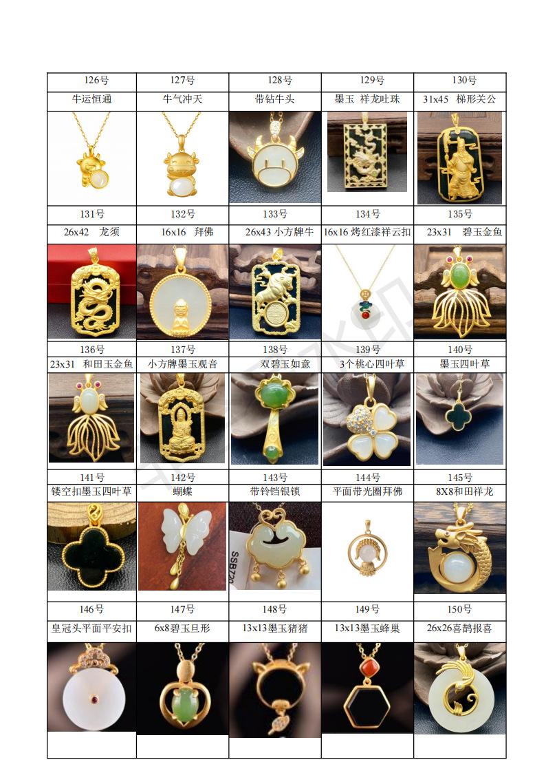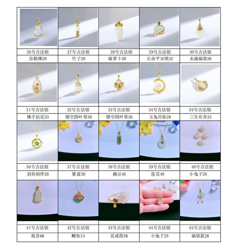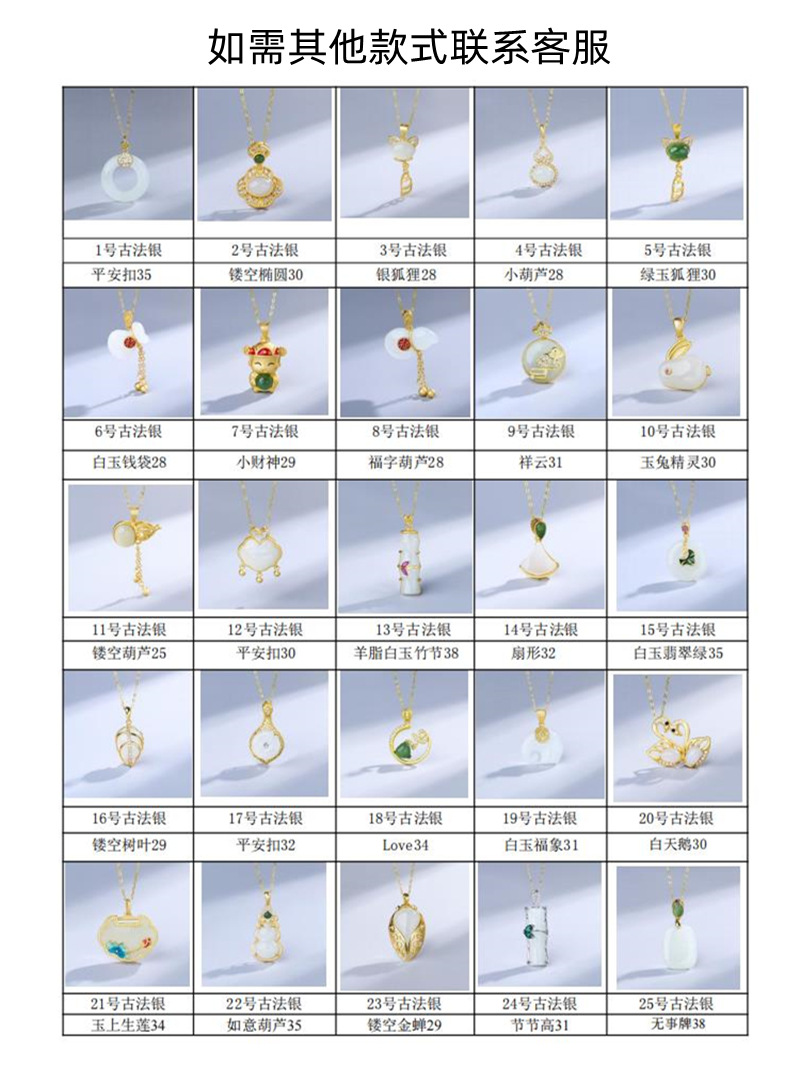 Золотая сумка; Будда без фазы; Трехмерный маленький монах-Новичок; Переплетение; Перенос бисера; Юбка с пряжкой из яшмы; Пончики 2; Дельфин Пинг Пряжка; Пряжка из яшмы серебряный замок; Маленькая Вишня; Четыре листа клевера с пряжкой из яшмы; Жуйи; Яшма четыре листа клевера; Высокая; Халцедон оливковые бусы; Юньнань цветок; Золотой чонсам; Богатая рука.; Слон Фортуны; Золотой Пиксиу; Жук; Полый персонаж фу; Смеющийся Будда; Пончики; Великий мудрец; Яшма Пряжка голова Высокая пряжка; Новый бамбук; Фанпай Гуаньинь; Мою площади Марка Дракон; Мо Ю Клык карты Гуань Гун; Бренд Дракон Мою; Чужеродные Гуань Гонг; Бренд Xiaofang Гуаньинь; «Свет Будды; Фу Ху Клык Бренд; Квадратная карточка Тигра; Браслет-четыре листа клевера; зеленый арахис; Сяньюнь Пин Ан Пряжка; Нитка счастливая сумка; Мини-сумка Lucky Charm
