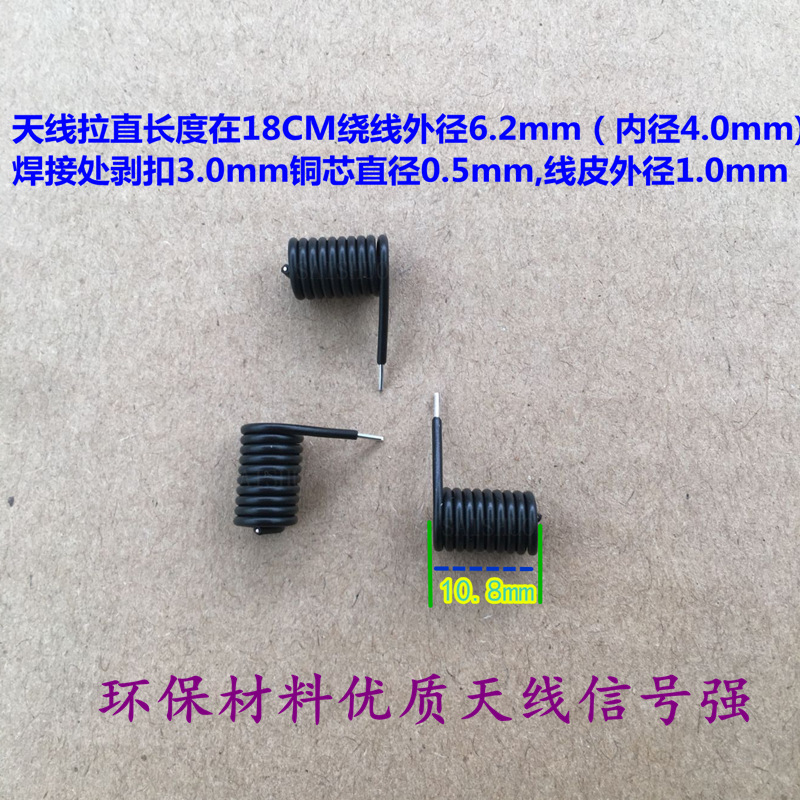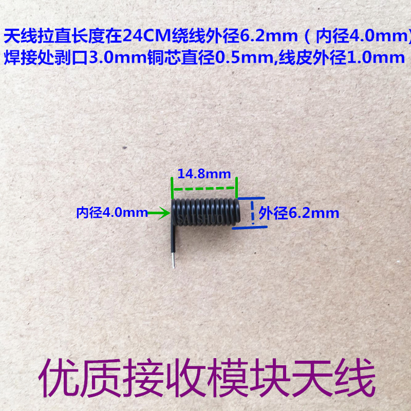 此天线拉直长度在24cm左右(接收效果好),绕线外直径在6.2mm左右,一端剥锡为3mm;铜线直径0.5mm 外径1.0mm、颜色为黑色一般接收模块和发射模块上面都可以使用,效果好信号强!