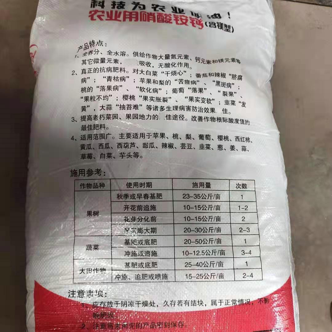 适用于多种土壤和作物,应用于温室和大田种植的粮食作物,经济作物,花卉、果树、蔬菜等。硝酸铵钙中的硝态氮无需先在土壤中转化而迅速溶解在水中直接为植物吸收。适用于基肥,种肥和追肥。