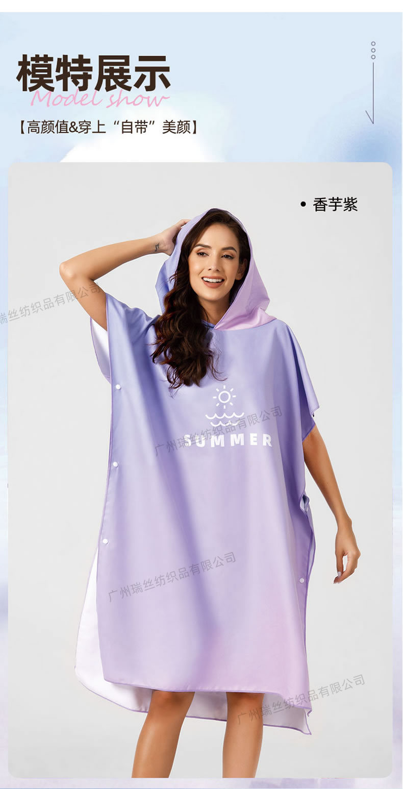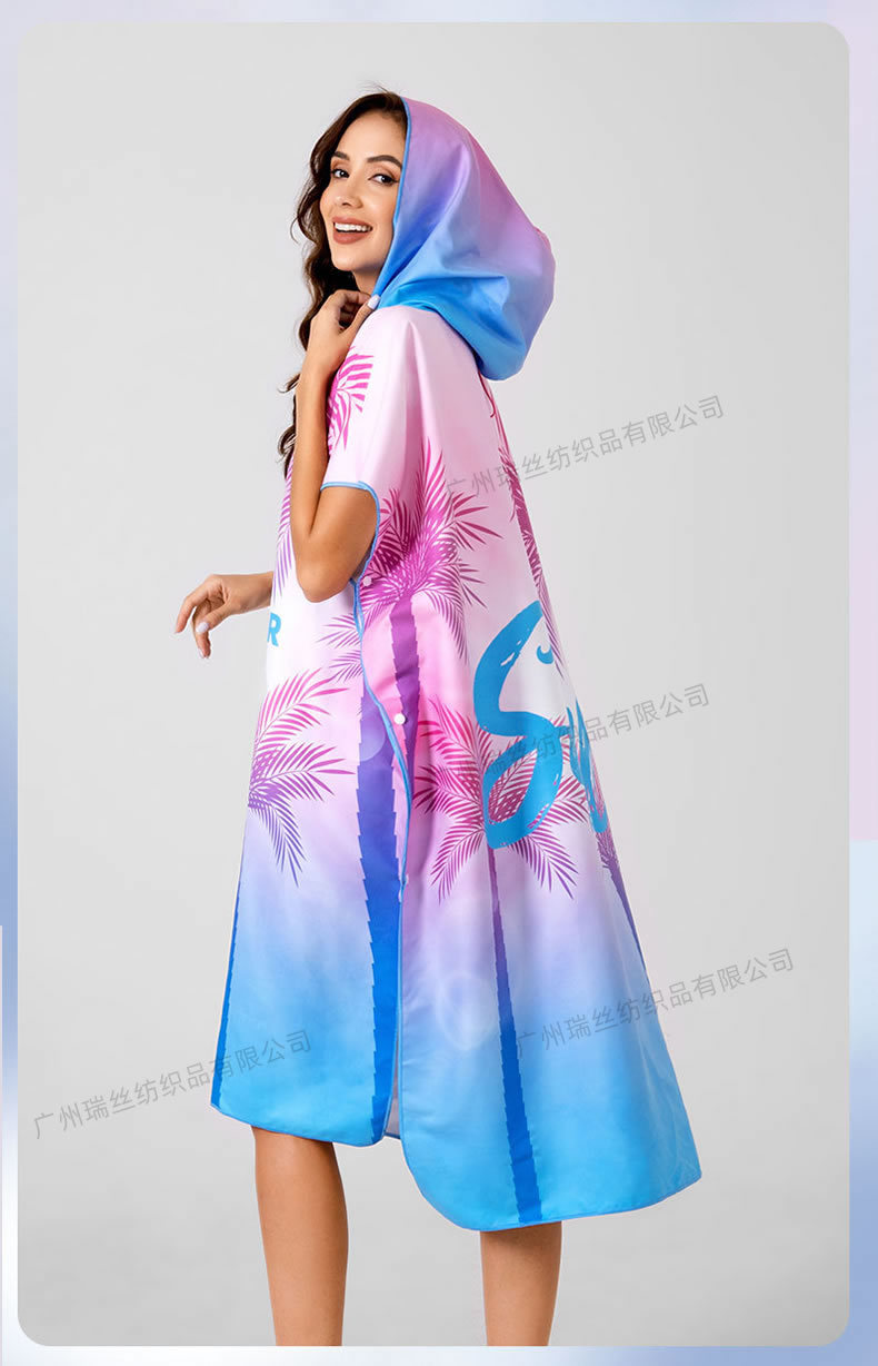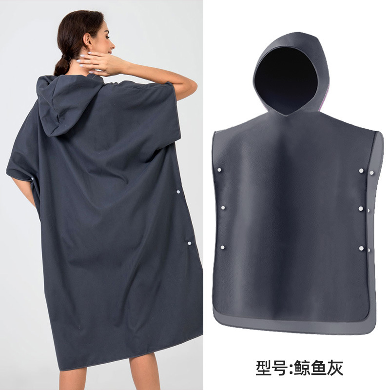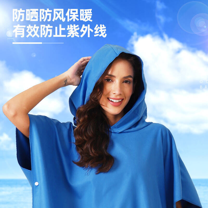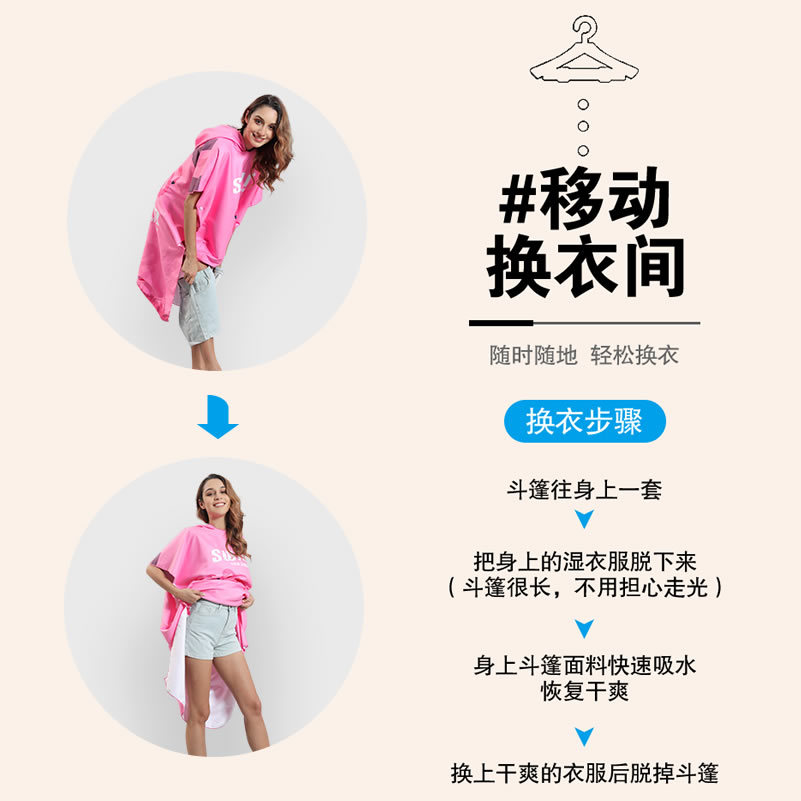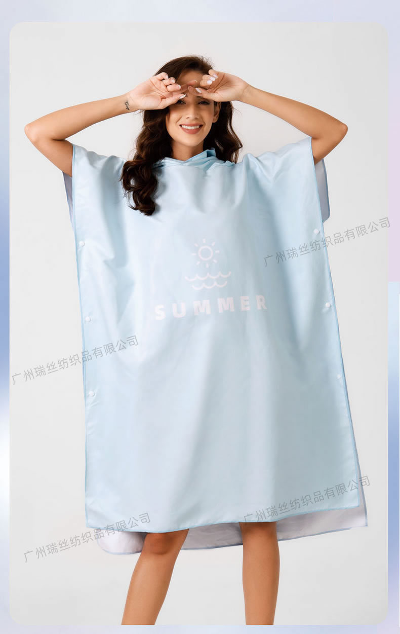 速干沙滩换衣浴袍:6个活动搭扣,穿脱容易,轻薄、速干、便携,游泳或海边换湿衣用得上!防走光保护隐私,版型宽松方便随时更换湿衣,省去更衣间排队的麻烦,也可用作沙滩泳衣罩衫,海滩观光散步省尴尬,防风保暖;另外可用作居家的冲凉浴袍,泳池游泳罩衫,泡温泉等都可用的上,超实用哦!