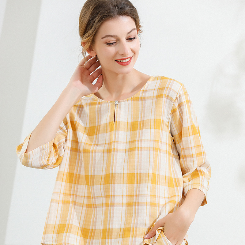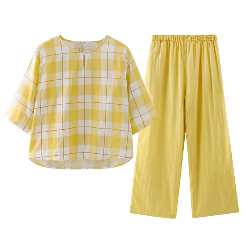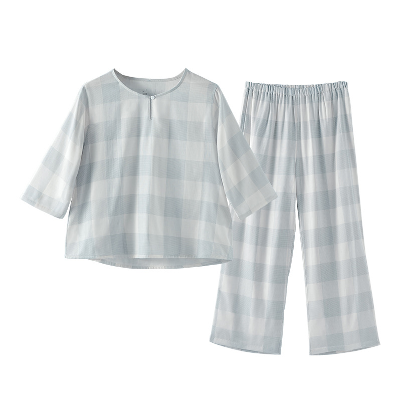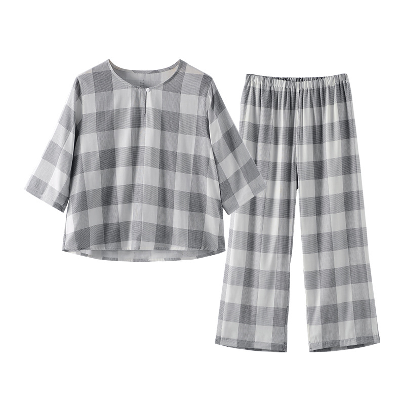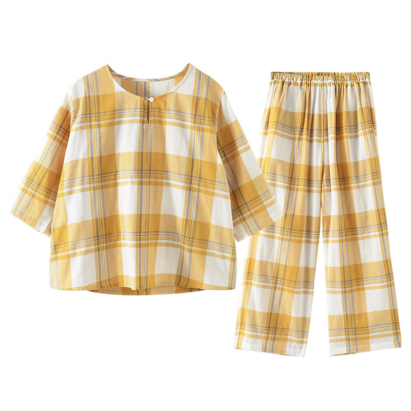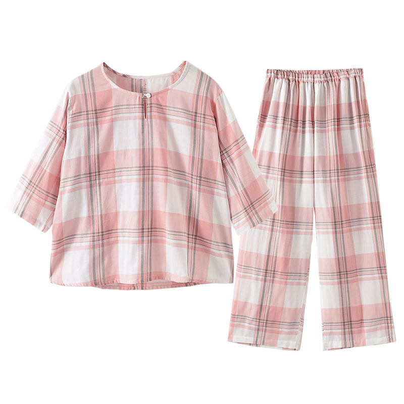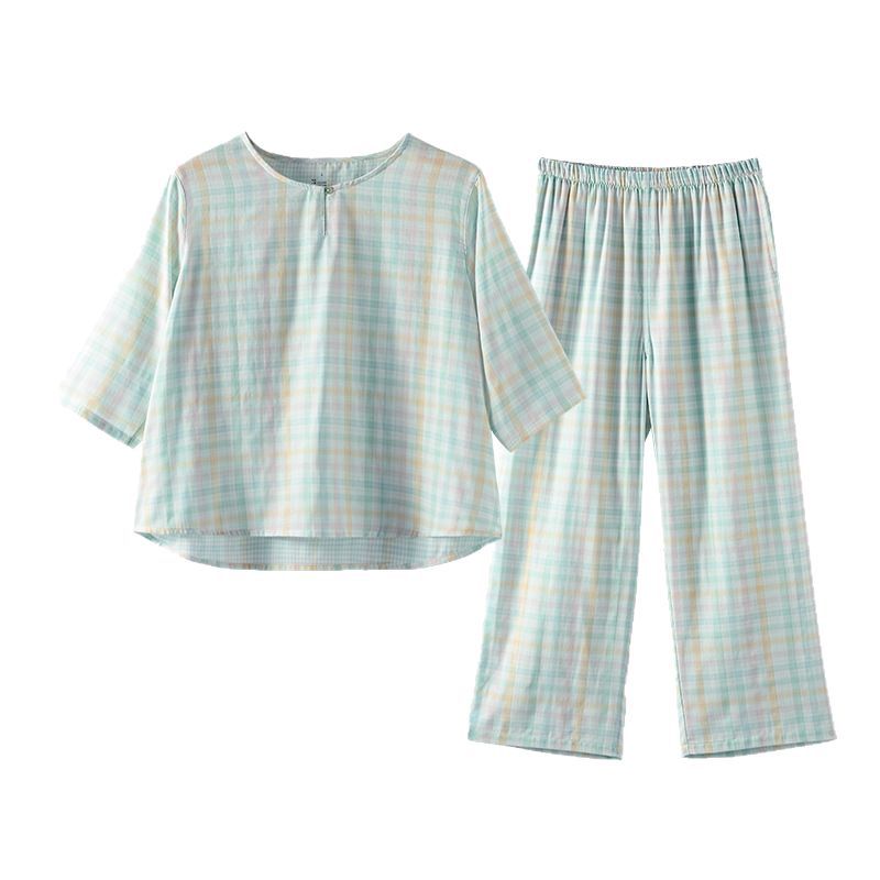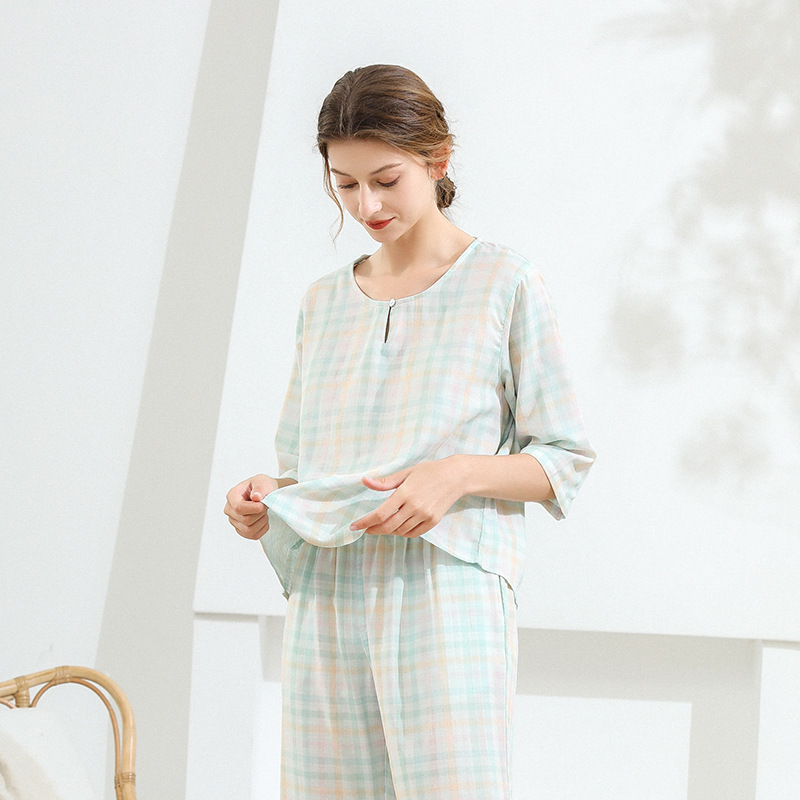 Новинка 2026 года: весенний хлопковый двухслойный муслиновый женский тонкий пижамный комплект с рукавом три четверти, в клетку, для дома, повседневный и комфортный.