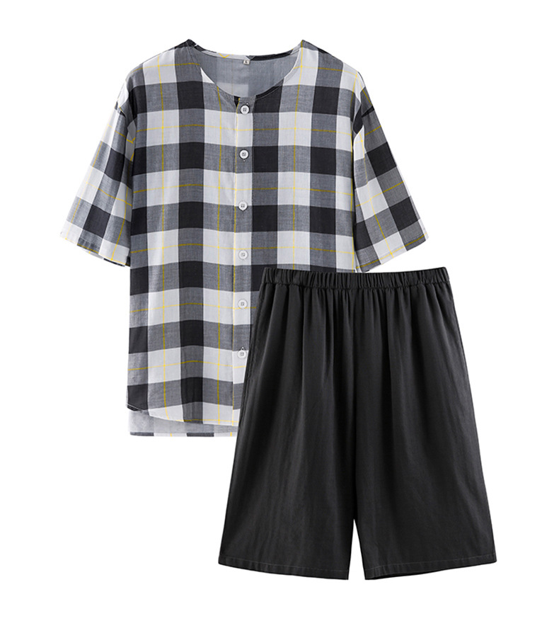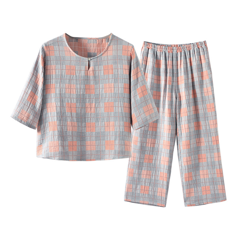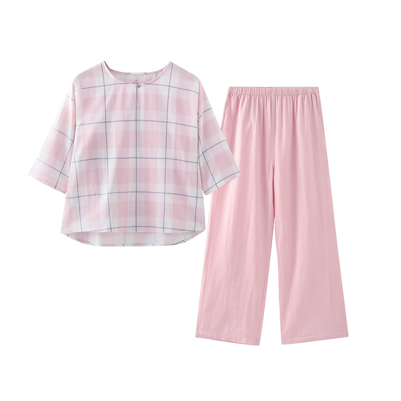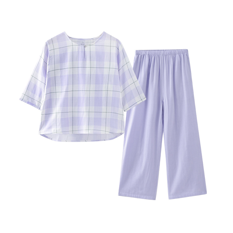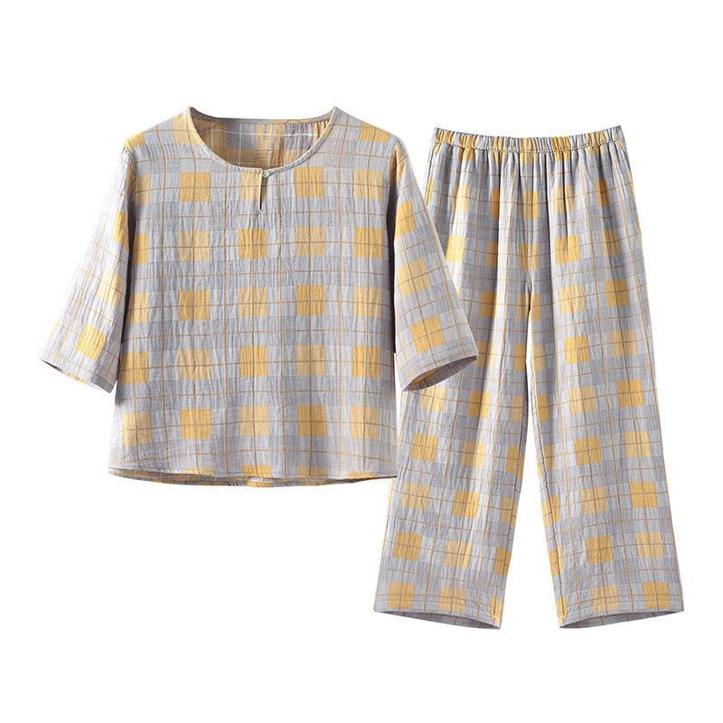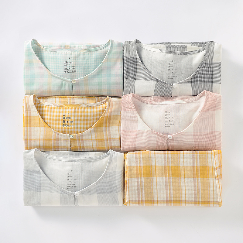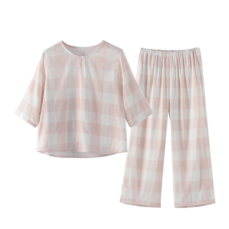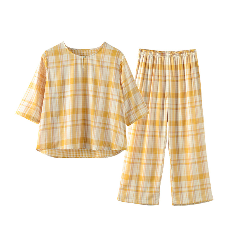 Новинка 2026 года: весенний хлопковый двухслойный муслиновый женский тонкий пижамный комплект с рукавом три четверти, в клетку, для дома, повседневный и комфортный.