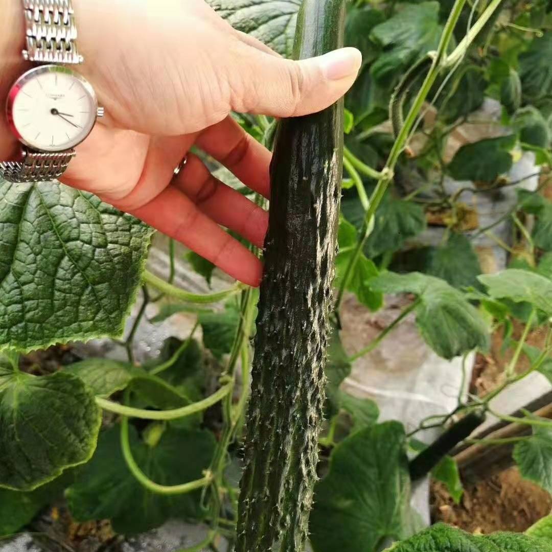 产品特性:叶片中等,主蔓结瓜为主,瓜码密,回头瓜多,瓜条生长速度快,丰产潜力大。早熟性好,耐低温弱光能力强,高抗霜酶病、枯萎病。瓜条顺直,皮色深绿,光泽度好,瓜把短,刺瘤密,腰瓜长36cm左右,商品瓜率高,单瓜中200g左右,果肉淡绿色,商品性 。适宜日光温室越冬茬及早春茬栽培。