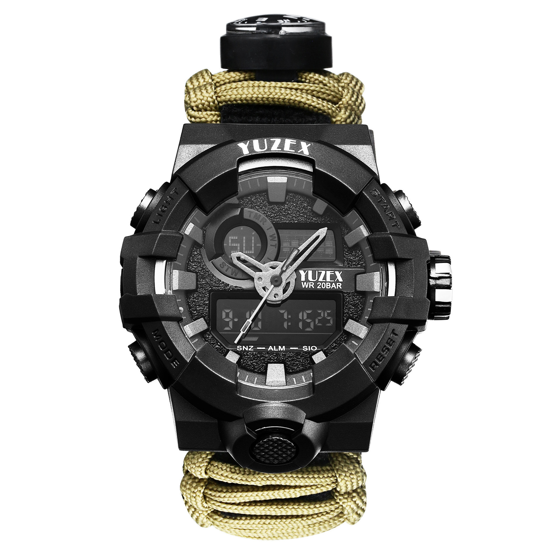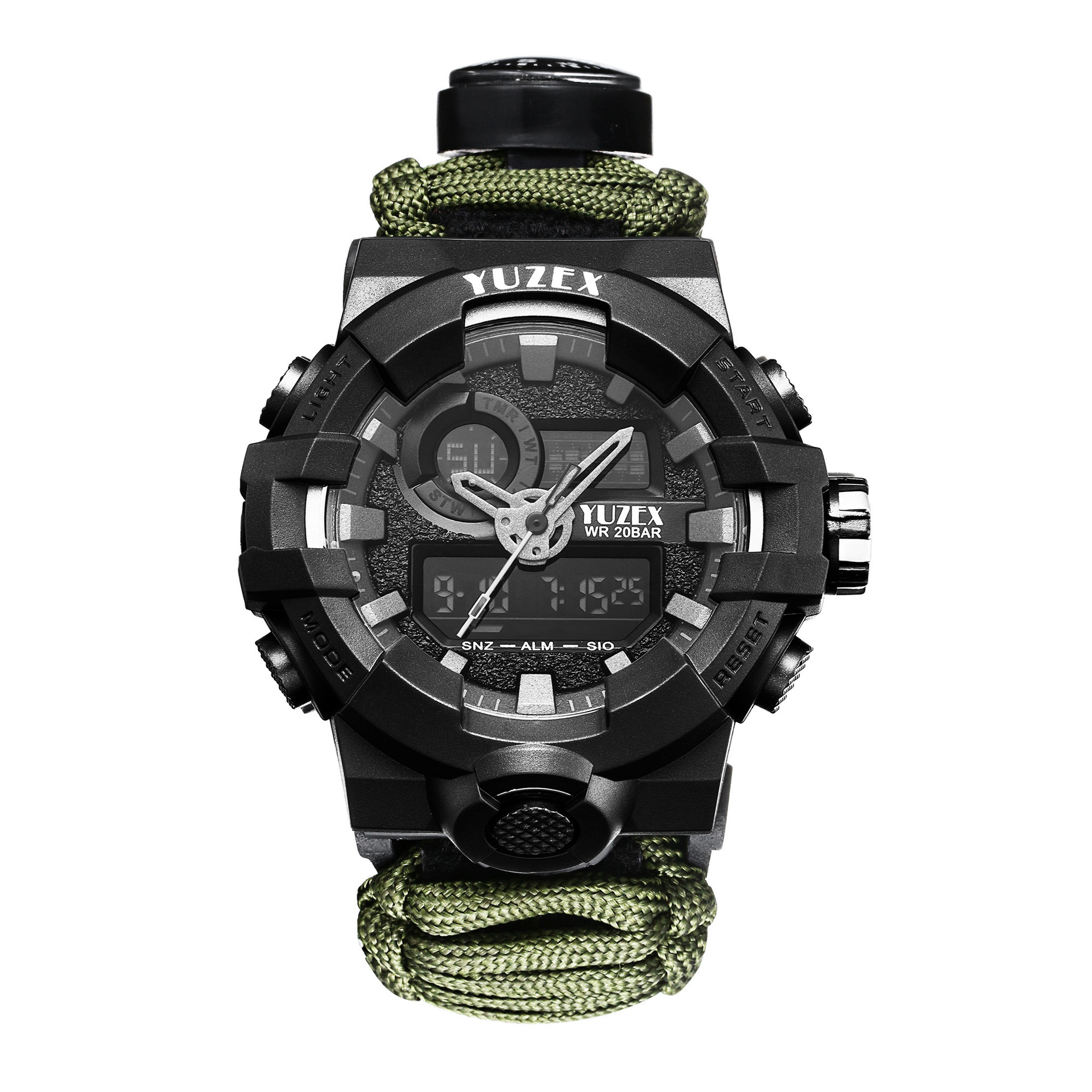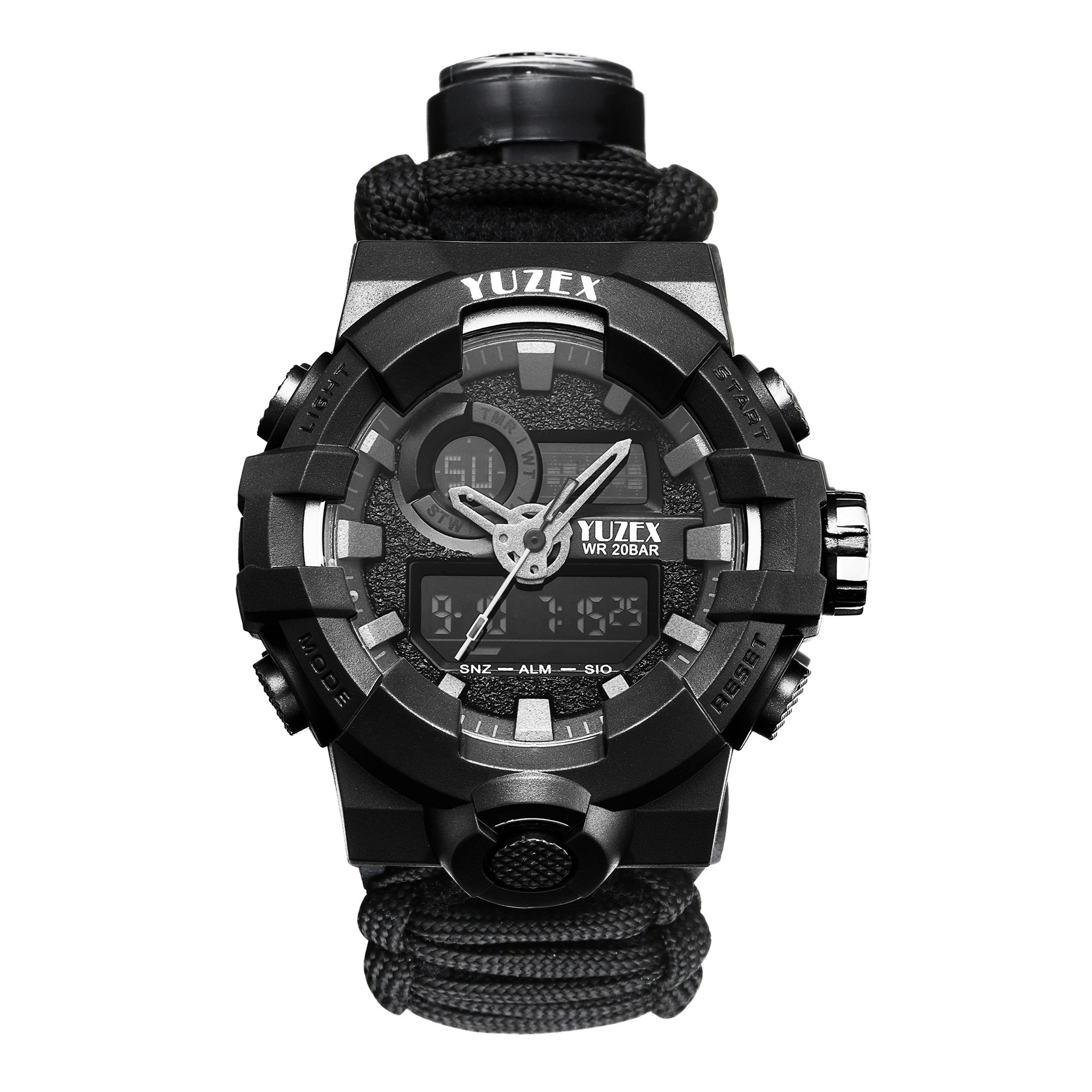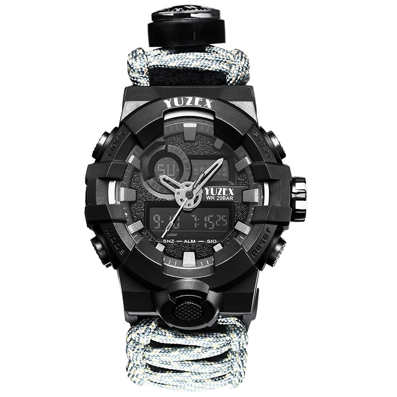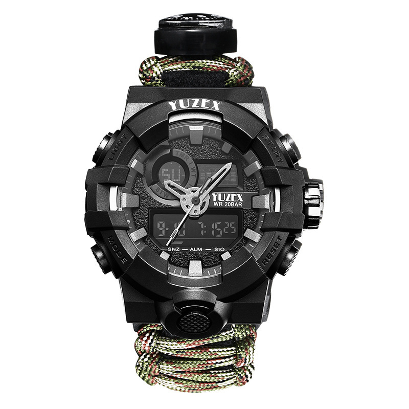 七芯伞绳编织热销夜光防水户外手表,它具有更多户外求生功能。配备了户外救生取火石、切绳刀、求生口哨、高精度指南针、温度计和一根长约3米左右的7芯伞绳,为您的户外探索提供安全保障。适合日常佩戴的手链饰品,紧急情况下可以拆开用于止血、制作陷阱、捆扎临时帐篷、穿套装备防止丢失等,可做紧急求救使用!所用的材料都是伞绳材质、与海船用的绳子一样,具有耐腐蚀、抗老化等优点、单绳拉力在400斤左右每把绳子重230克-240克。