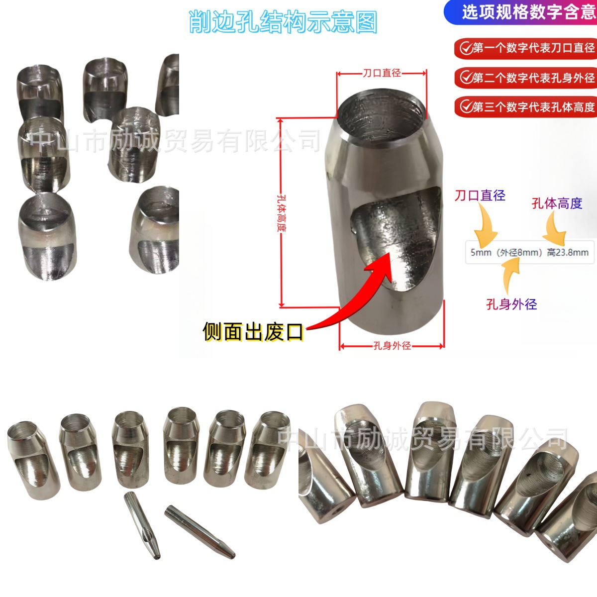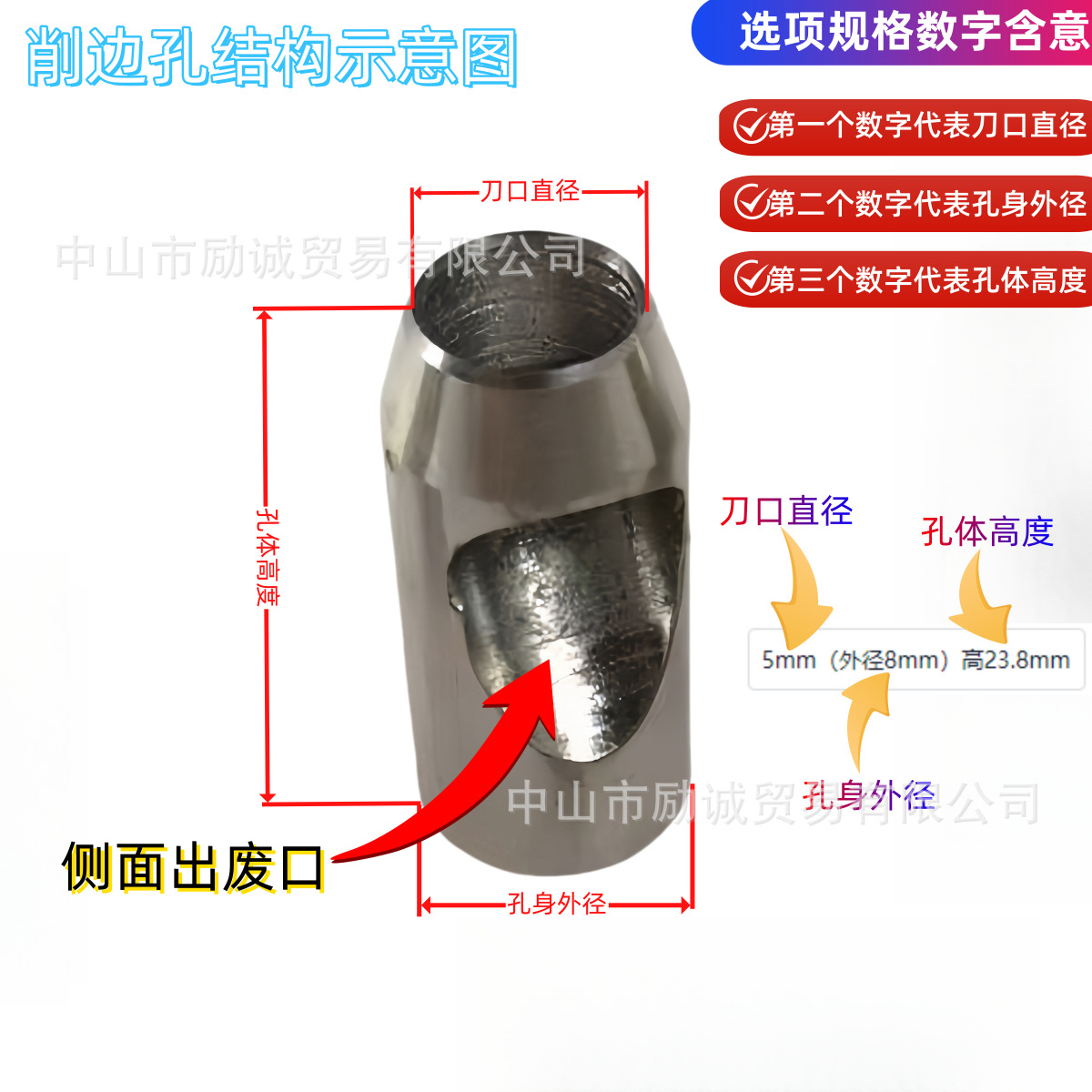 这款削边孔,为仿进口品质,高硬度钢材制作,外层电镀。有外径比刀口大2mm,也有部分外径比刀口大3mm的,注意确定尺寸,高度23.80mm,刀口锋利。