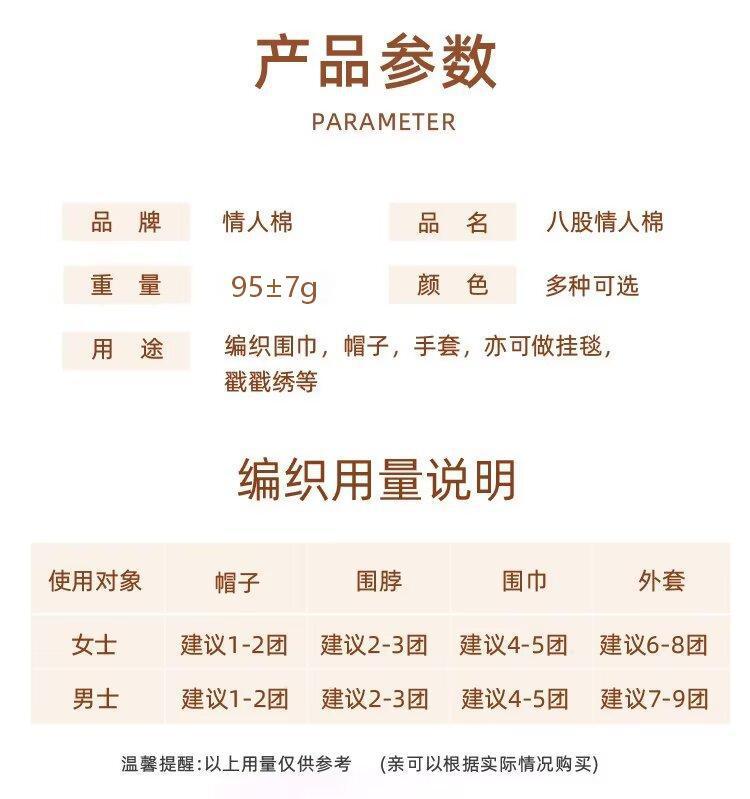 宝贝特点:多股情人棉是八股线。此款产品属于粗毛线,适合编织围巾、帽子、毛衣、外套、帽子、宝宝衣物等,产品为轴形状