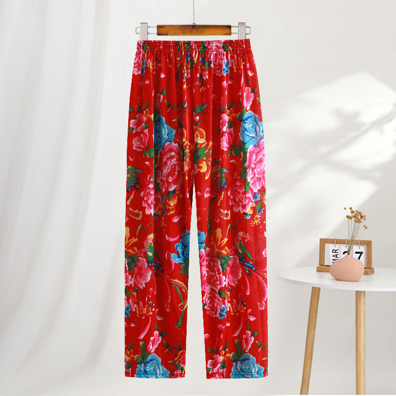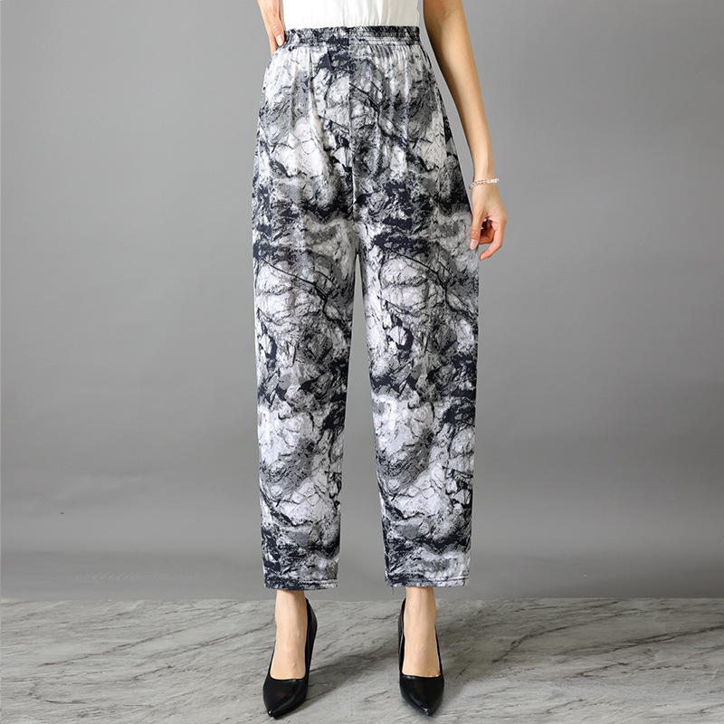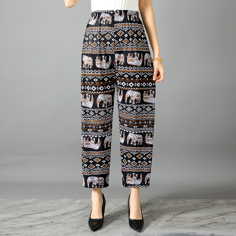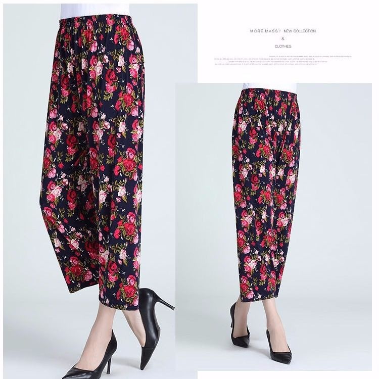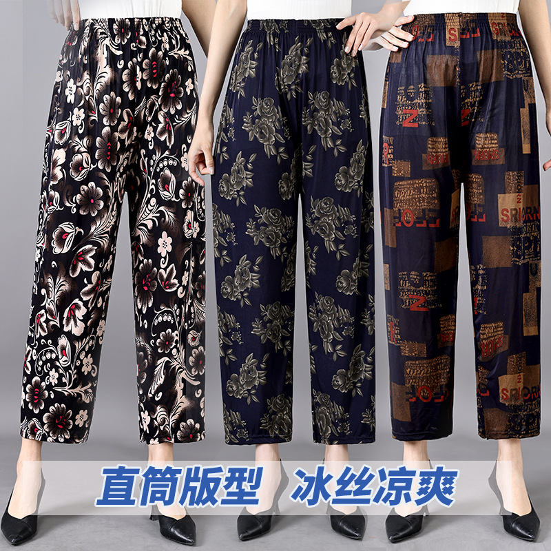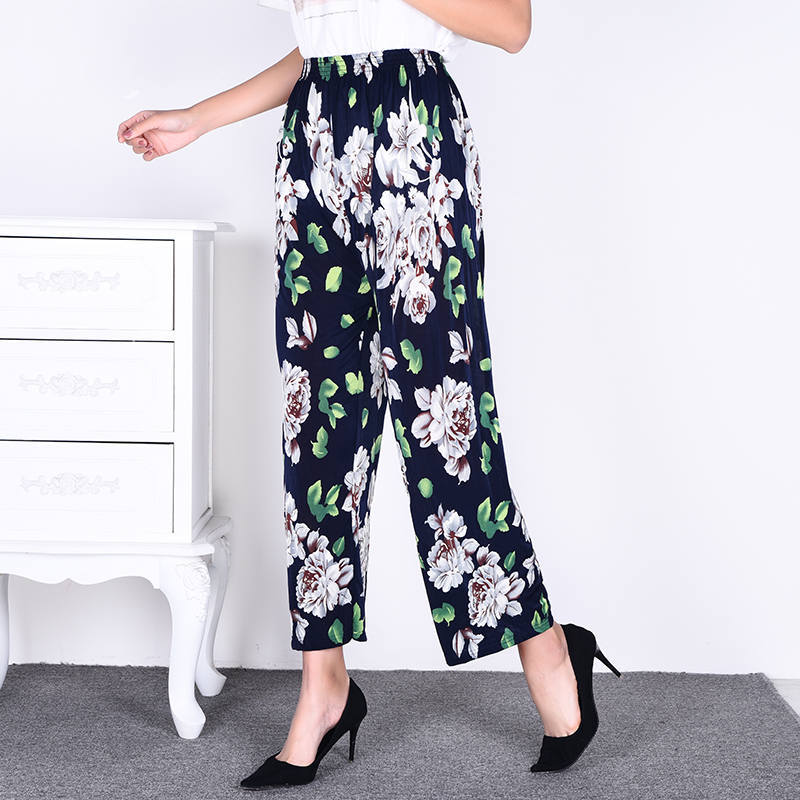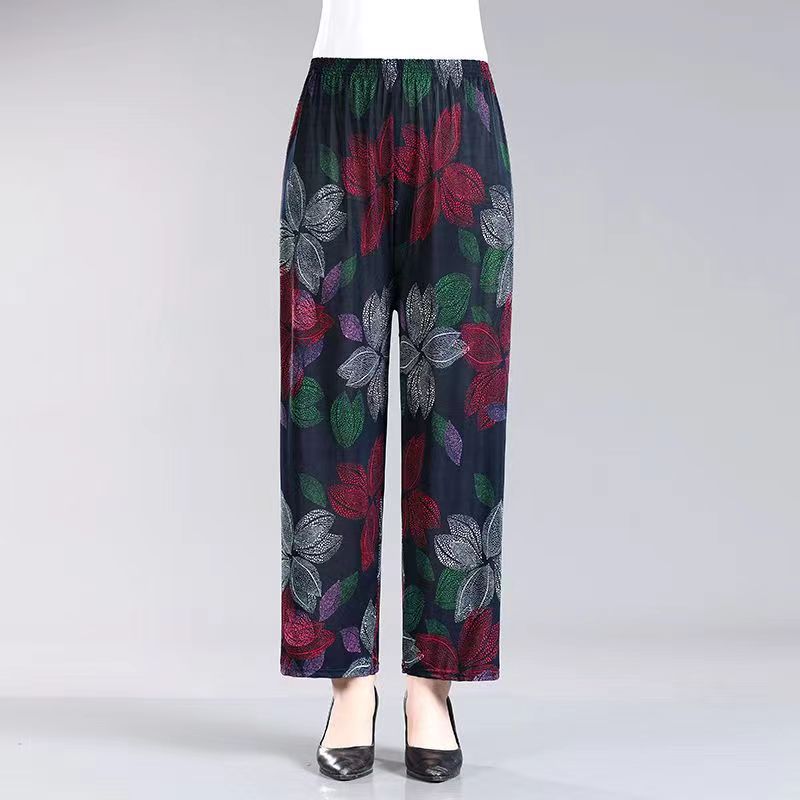 Летние женские крутые брюки с цветочным принтом, прямые брюки с кондиционером, эластичные повседневные домашние брюки для мам среднего и пожилого возраста, девятиточечные брюки для мам