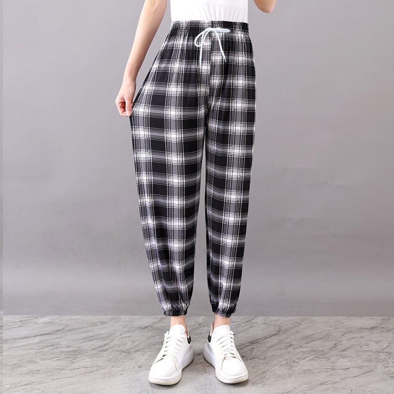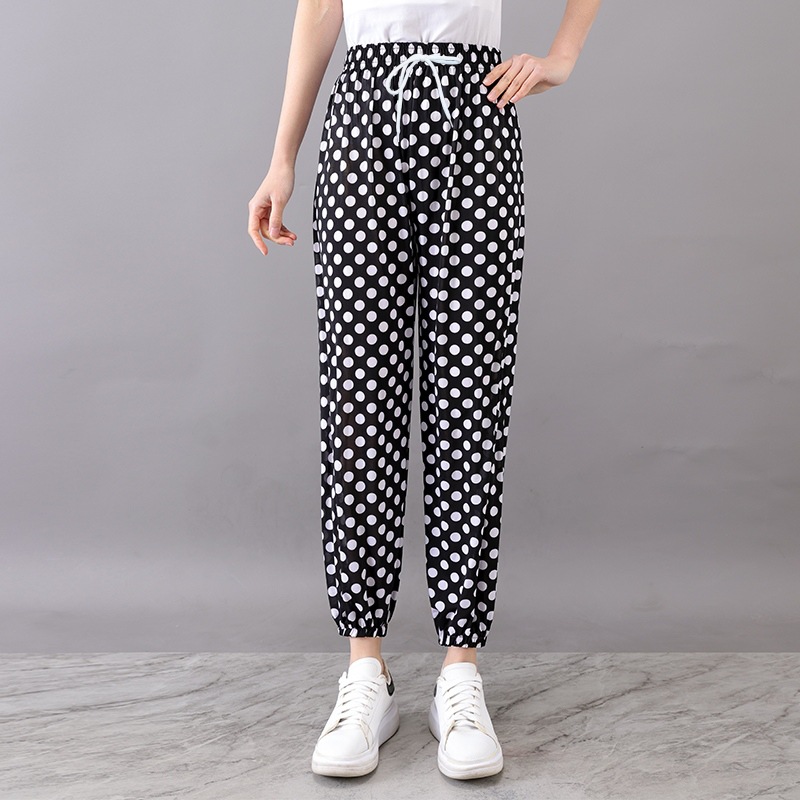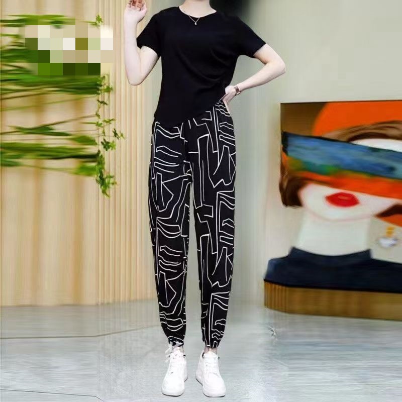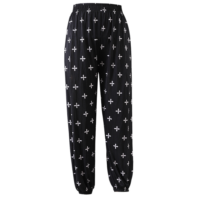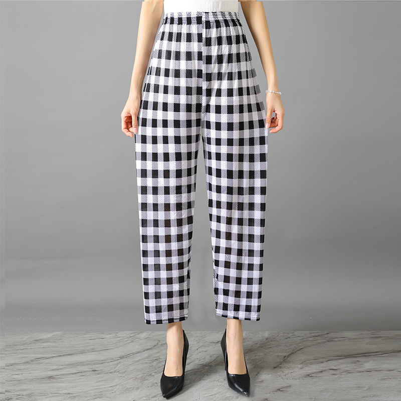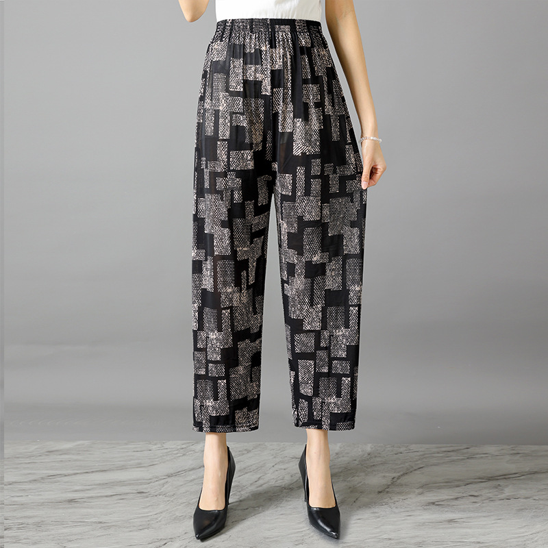 Летние женские крутые брюки с цветочным принтом, прямые брюки с кондиционером, эластичные повседневные домашние брюки для мам среднего и пожилого возраста, девятиточечные брюки для мам