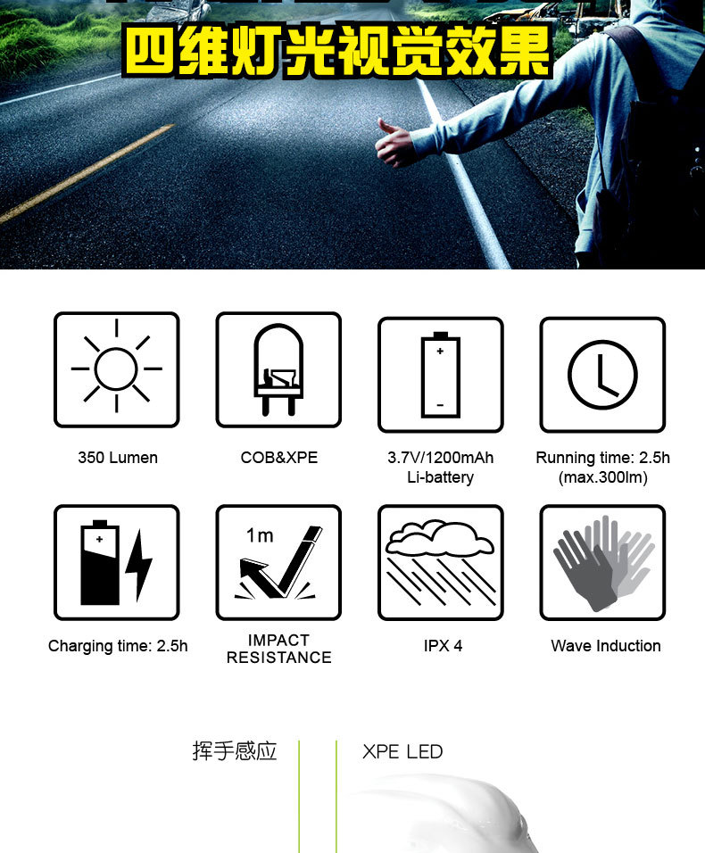 (一档) COB高亮: 350流明,照明时间2.5~3H