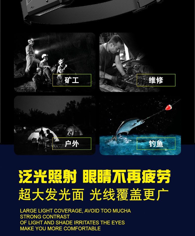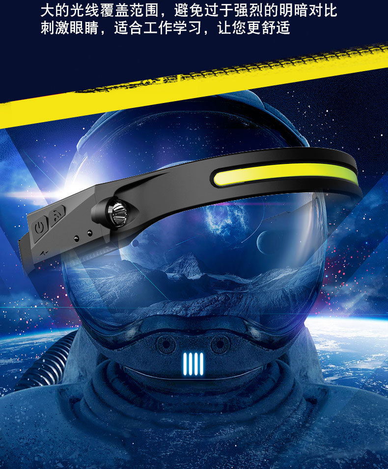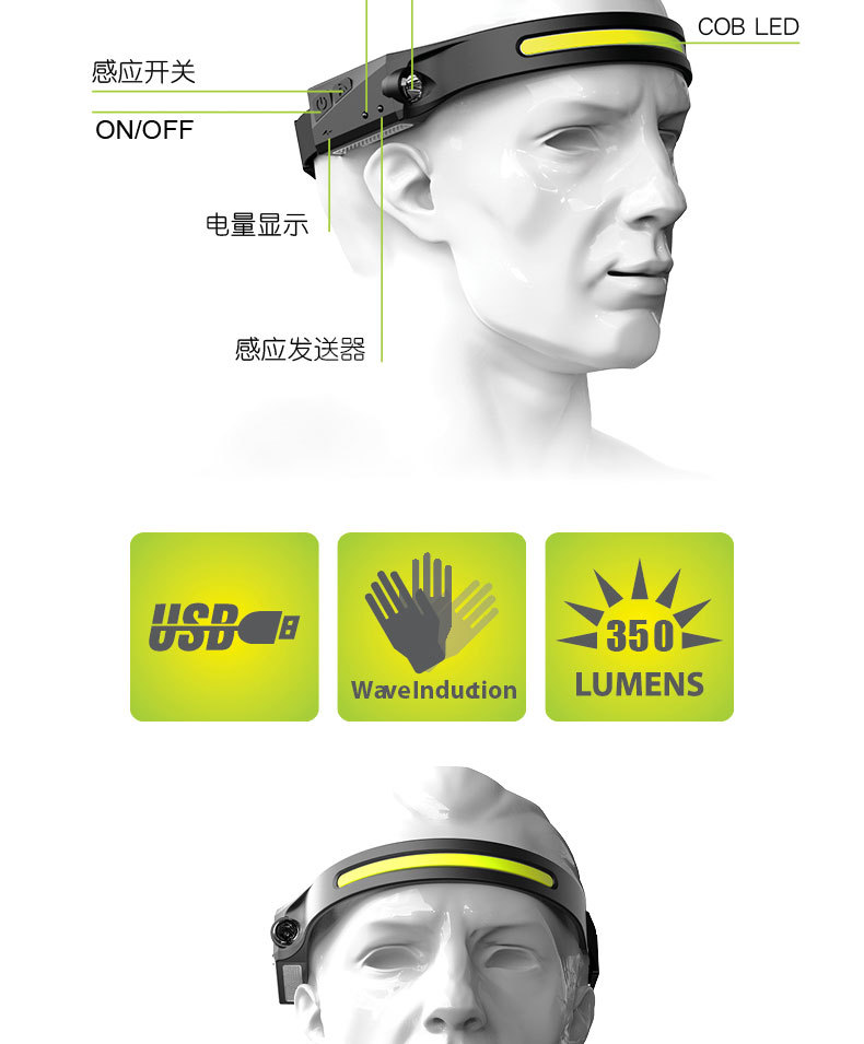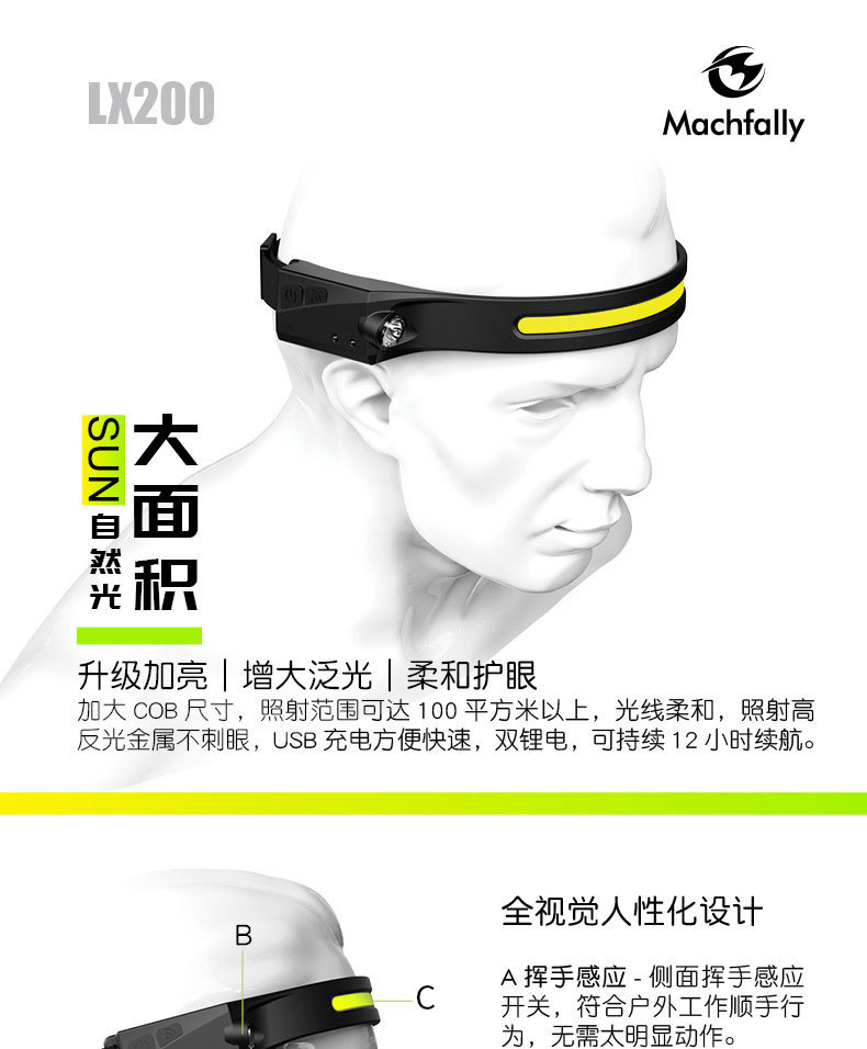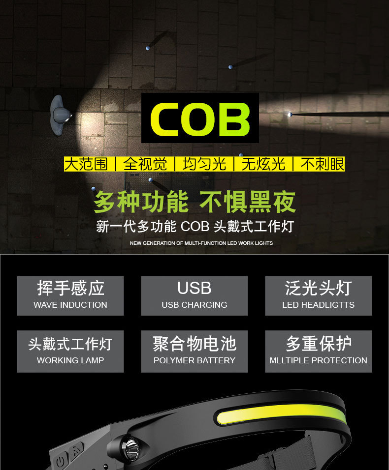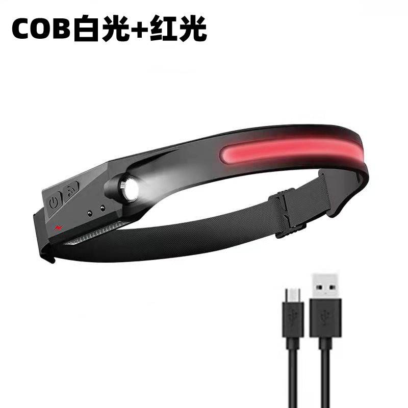 轻触开关:COB强光 ->COB 中光 ->侧灯高亮--侧灯低亮 , 长按切换到爆闪,感应开关按下切换到感应模式