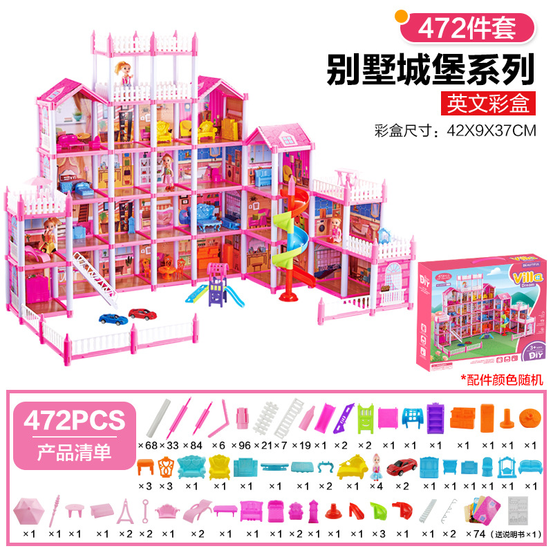 | DSJ589-A:【472件套】 | 四层26房+5阳台+院子+滑梯+滑滑梯+2小车 | 英文彩盒 | 100x61x75cm | 42x9x37cm | 12盒 | 70*44*76cm |