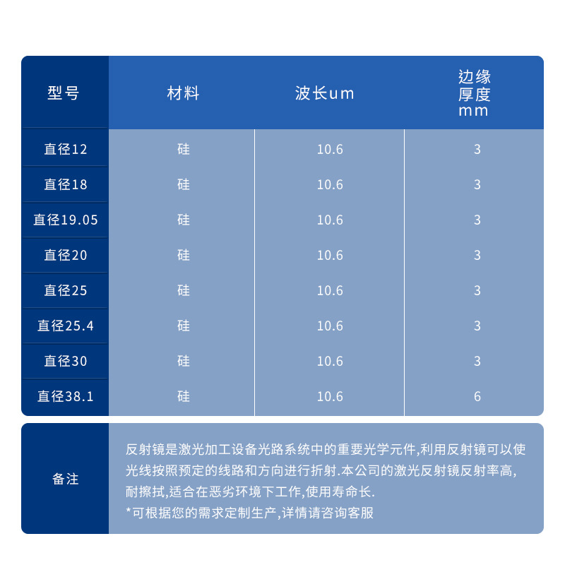 | 硅反射镜 | 单晶硅 | 直径20/直径25/直径30/直径38.1 | 60-400W | 点击购买 | |