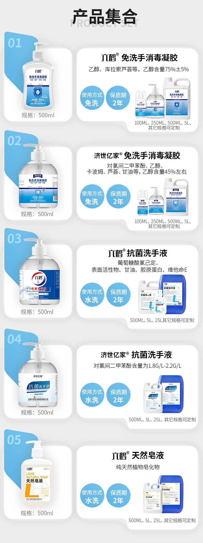 Jishi Yijia 500 мл гелевая круглая бутылочка без смывания (дезинфицирующее средство для рук без мытья); Liuhe несмываемый гель 100мл (дезинфицирующее средство для рук без смывания); Гель Liuhe No-Rinse 250 мл (дезинфицирующее средство для рук без смывания); Liuhe несмываемый гель 500мл (дезинфицирующее средство для рук); Liuhe no-rinse гель длинная насадка насоса 500мл (дезинфицирующее средство для рук); Антибактериальное дезинфицирующее средство для рук Jishiyijia 500 мл (мытое); Антибактериальное дезинфицирующее средство для рук Liuhe 500 мл (мытое); Антибактериальный антисептик для рук Six Cranes, 500 мл (без запаха, можно мыть); Дезинфицирующее средство для рук с натуральным мылом 500мл (можно мыть); Jishiyijia Liuhe гель для дезинфицирующего средства для рук 500мл (квадратная бутылочка); Пенка для дезинфекции рук без смывания, 500 мл (пенка)