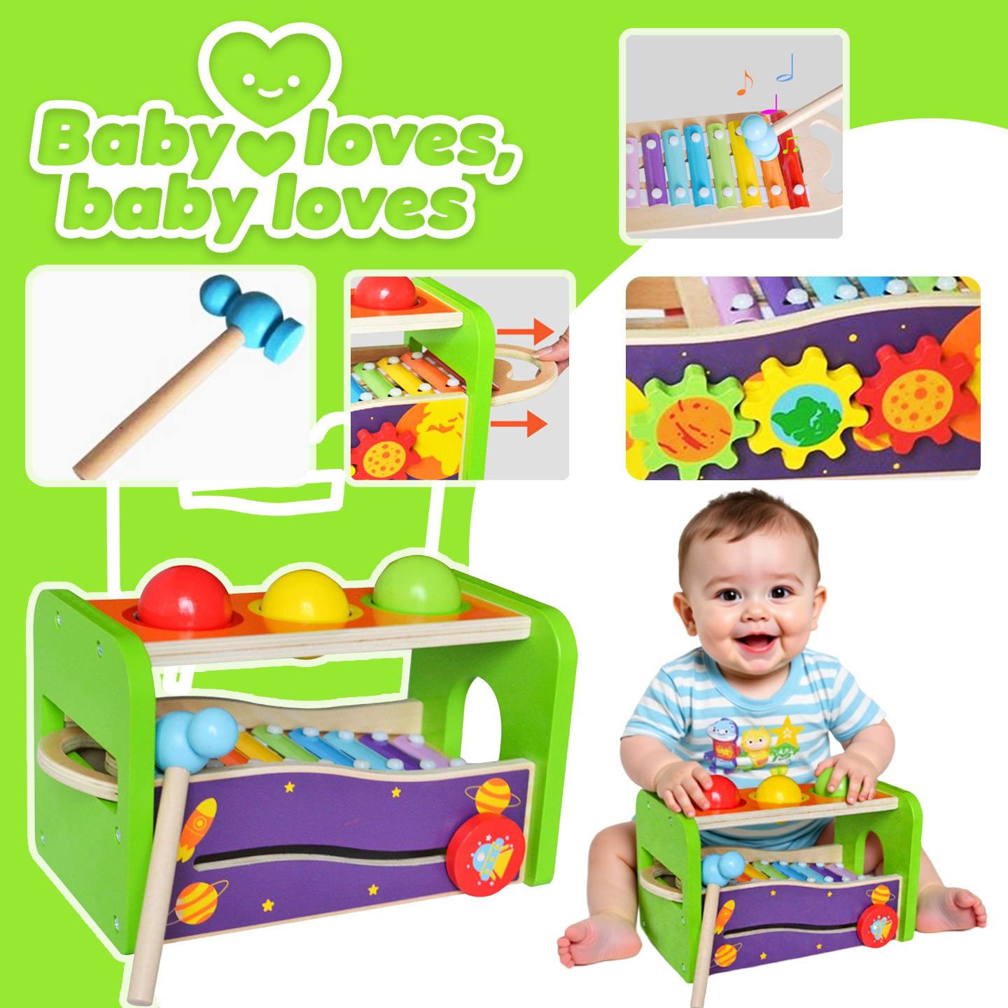 敲球台:宝宝们喜欢有声音的物体,敲击对肢体运动感觉很有帮助,同时也锻练手眼协调能力。