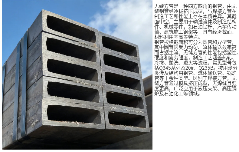 Бесшовные квадратные трубы Q345B используются для контейнерных вагонов, строительства и стальных конструкций квадратной и прямоугольной формы в Уси, изготовленных из материала по национальному стандарту с толстыми стенками.