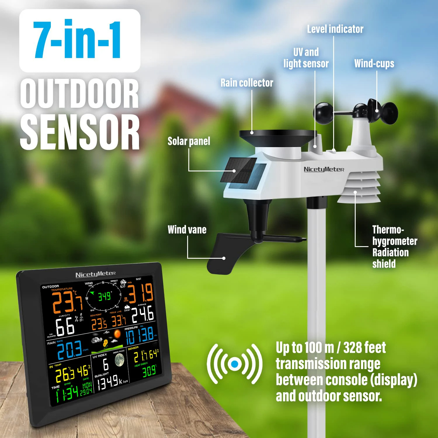 Сверхчеткая WiFi-метеостанция с большим экраном | 7-в-1 наружный датчик для мониторинга в реальном времени ветра, дождя/УФ-излучения + предупреждение о опасностях