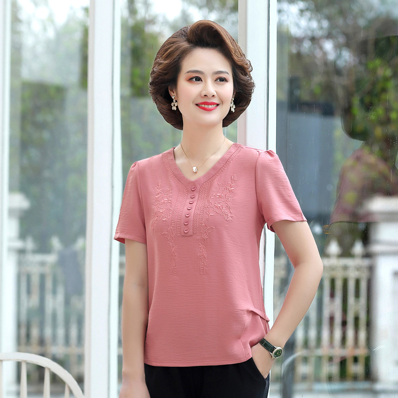 Летняя футболка для мам среднего возраста с короткими рукавами, топ 2021, новинка, стильная повседневная Базовая свободная футболка с вышивкой и V-образным вырезом для среднего и пожилого возраста