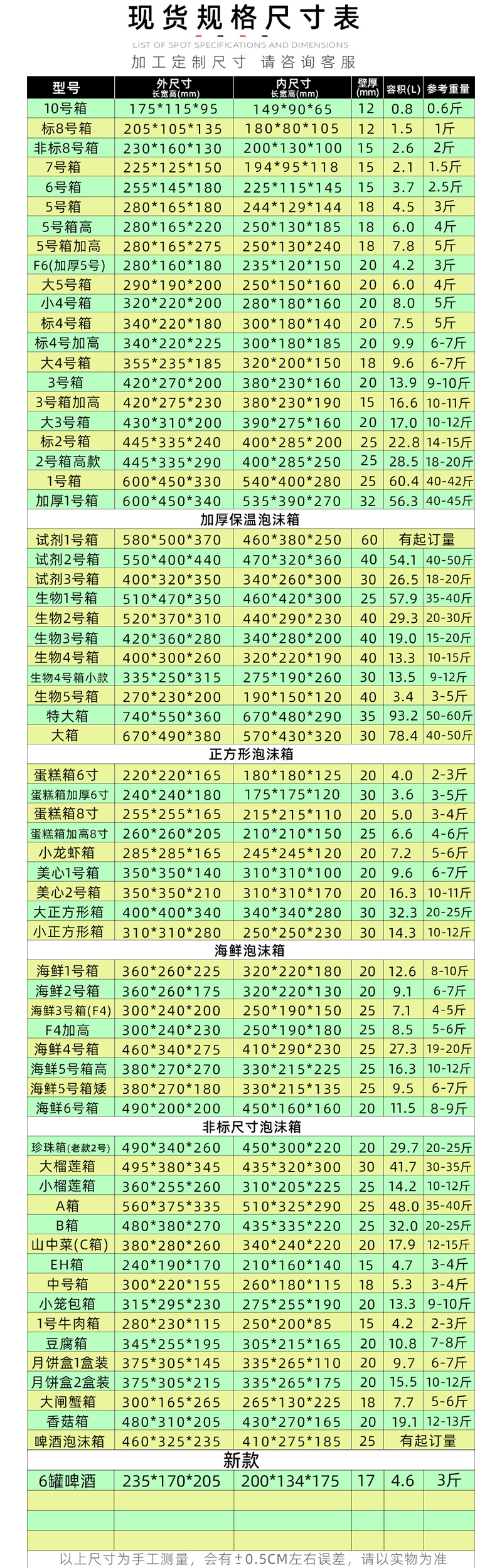 Пенопластовая коробка; (2.5kg) Малый размер 4 32*22*20 [Заказ кратно 24]; Пенопластовая коробка; Коробка №6 25,5*15*18 толщиной 1,5 [заказ кратно 40]; Пенопластовая коробка; №5 28*16,5*19 толщина 1,7 [заказать в 40 раз]; Пенопластовая коробка; коробка №4 34*22*18 толщина 1,8 [заказ кратно 30]; Пенопластовая коробка; (5kg ) №3 коробка 42*27*20 [Заказ кратно 14]; Пенопластовая коробка;F5 28,5*23,5*22,8; Пенопластовая коробка; высокий №3 42*27*23; Пенопластовая коробка; большой размер 3 43*31,5*20 толщина 2 [заказ кратно 14]; Пенопластовая коробка; утолщенное №3 42*28*20 толщина 2,5 [заказать кратно 12]; Пенопластовая коробка; большой размер 4 35*23*19 толщина 1,7 [заказ кратно 32]; Пенопластовая коробка; маленький размер 4 короткий [заказ кратно 25] 32*22*15; Пенопластовая коробка; высокий №4 34*22*22,5 толщина 2 [заказ кратно 24]; Пенопластовая коробка; высокий №5 28*16,5*26 толщина 1,7 [заказ кратно 24]; Пенопластовая коробка; большой размер 5 29*19*20 толщина 2 [заказывать кратно 28]; Пенопластовая коробка; средний размер 5 28*16,5*22 толщина 1,7 [заказывать по 24 шт.]; Пенопластовая коробка; Коробка №10 17,5*11,5*9,4 толщина 1,2 [заказывать по 90 раз]; Пенопластовая коробка; коробка стандартная №8 20,5*10,5*13,5 толщина 1,2 [заказывать по 60 раз]; Пенопластовая коробка; нестандартный ящик №8 23*16*13 толщиной 1,5 [заказ кратно 50]; Пенопластовая коробка; Коробка №7 22,5*12,5*16 толщиной 1,5 [заказывать по 40 раз]; Пенопластовая коробка; утолщенный №5 28*16*18 толщина 2,1 [заказать по 40 раз]; Пенопластовая коробка; Коробка №2 45*33,5*22 толщина 2,3 [заказ кратно 12]; Пенопластовая коробка; №2 высота 45*33,5*29 толщина 2,3 [заказать по 12 раз]; Пенопластовая коробка; Шкатулка жемчужная 49*34*26 толщина 2 [Заказ кратно 12]; Пенопластовая коробка; Морепродукты №1 36*26*22,5 толщина 2 [Заказ кратно 26]; Пенопластовая коробка; Морепродукты №2 36*26*17,5 толщина 2 [Заказ кратно 26]; Пенопластовая коробка; Морепродукты №4 46*34*27 толщина 2,5 [заказ кратно 12]; Пенопластовая коробка; 8П (30*24*23) толщина 2,5 [заказывать по 18 раз]; Пенопластовая коробка; Морепродукты №5 высота 38*27*26 толщина 2,5 [заказать по 20 раз]; Пенопластовая коробка; Морепродукты №5 короткие 38*27*18 толщиной 2,5 [заказать по 20 раз]; Пенопластовая коробка; F4 (30*24*20) толщина 2,5 [заказ кратно 18]; Пенопластовая коробка; Коробка B 47*37*28 толщиной 2,5 [заказывать по 12 шт.]; Пенопластовая коробка; Коробка 56*37*33; Пенопластовая коробка; коробка среднего размера 30*22*15,5 толщиной 1,8 [заказывать кратно 36]; Пенопластовая коробка; Кухня Ямано 38*28*26 толщина 2 [заказ кратно 18]; Пенопластовая коробка; коробка для лунного торта 37,5*30,5*21,5 толщина 2,3 [заказ кратно 12]; Пенопластовая коробка; коробка для тофу 34,5*25,5*19,5 толщиной 2 [заказывать кратно 27]; Пенопластовая коробка; коробка для волосатых крабов 30*16,5*26 толщина 1,5 [заказ кратно 24]; Пенопластовая коробка; №1 коробка 60*45*32 толщина 2,5 [заказ кратно 6]; Пенопластовая коробка; №1 утолщенная 60*45*34 толщина 3 [заказ кратно 6]; Пенопластовая коробка; очень большой размер 67*49*38 толщина 3 [заказывать в 3 раза]; Пенопластовая коробка; большая аптечка закаленная 74*55*36 толщина 3 [заказывать в 3 раза]; Пенопластовая коробка; большая коробка для дуриана 49,5*38*34,5 толщина 3 [заказывать кратно 6]; Пенопластовая коробка; маленькая коробочка для дуриана 36*25,5*26 толщиной 2,5 [заказывать кратно 12]; Пенопластовая коробка; HL коробка 24*19*17; Пенопластовая коробка + картонная коробка; (2.5kg) Малый размер 4 32*22*20 [Заказ кратно 24]; Пенопластовая коробка + картонная коробка; №6 коробка 25,5*15*18 толщина 1,5 [заказать по 40 раз]; Пено