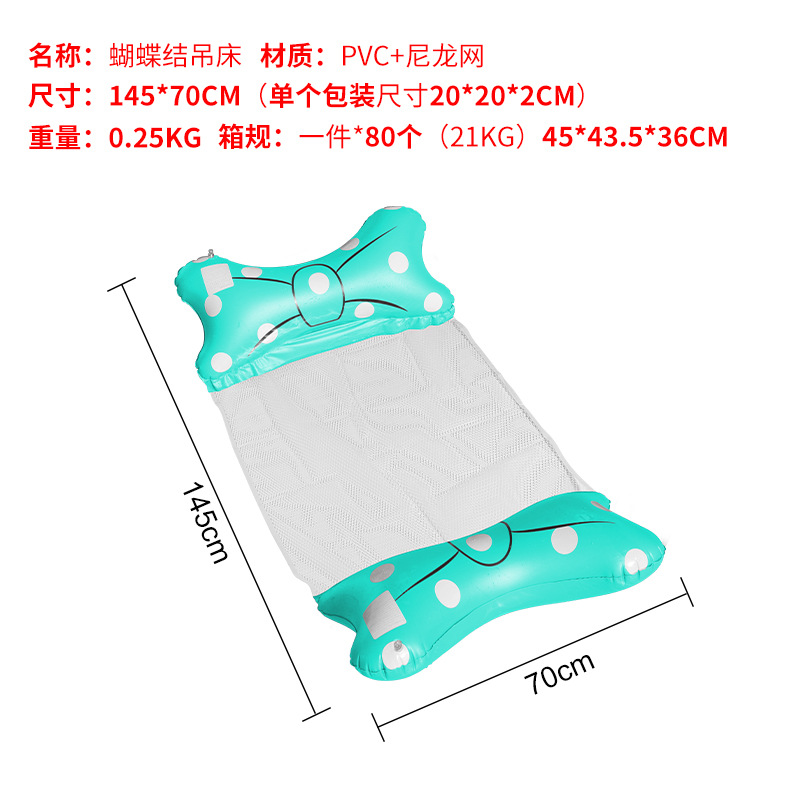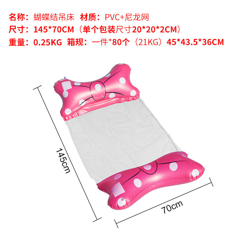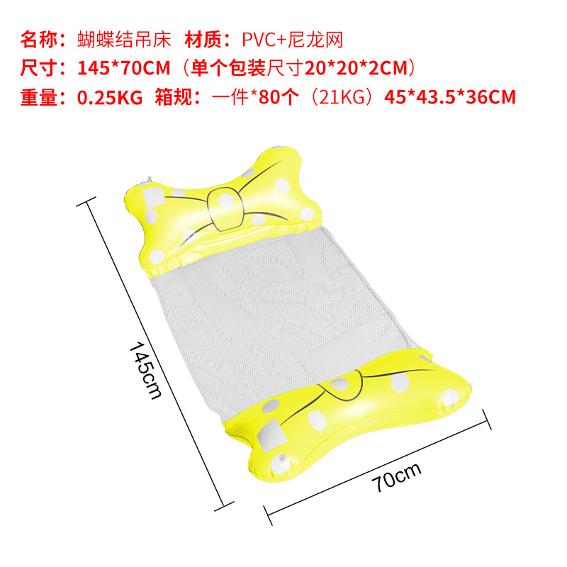 NAME|名称:蝴蝶结吊床 SIZE|尺寸:145*70CM PACKING|包装:OPP彩卡包装 WEIGHT|重量:单个0.25KG 整箱21KG PACKAGE SIZE|单个包装尺寸:20*20*2CM MATERIAL|材质:PVC COLOUR|颜色:黄色、绿色、玫红色 SPEC|箱规:44*43.5*36CM QUANTITY|装箱数量:80PCS