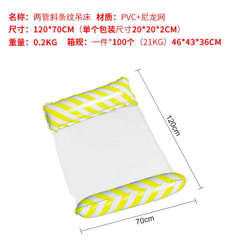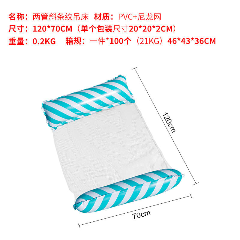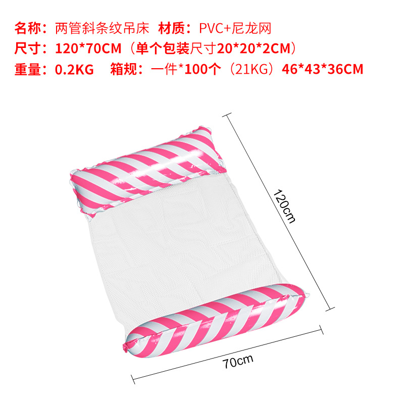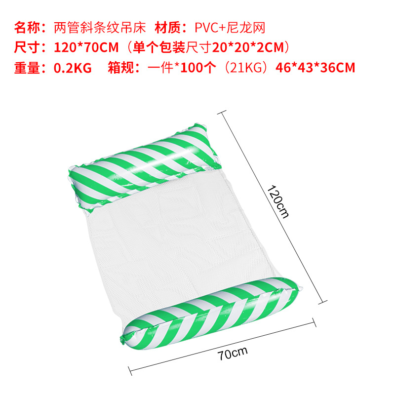 NAME|名称:斜条纹吊床 SIZE|尺寸:122*70cm PACKING|包装:OPP袋包装+彩卡 WEIGHT|重量:单个0.2KG 整箱21KG PACKAGE SIZE|单个包装尺寸:20*20*2CM MATERIAL|材质:PVC+尼龙网 COLOUR|颜色:蓝色、绿色、玫红色、黄色 SPEC|箱规:46*43*36CM QUANTITY|装箱数量:100PCS