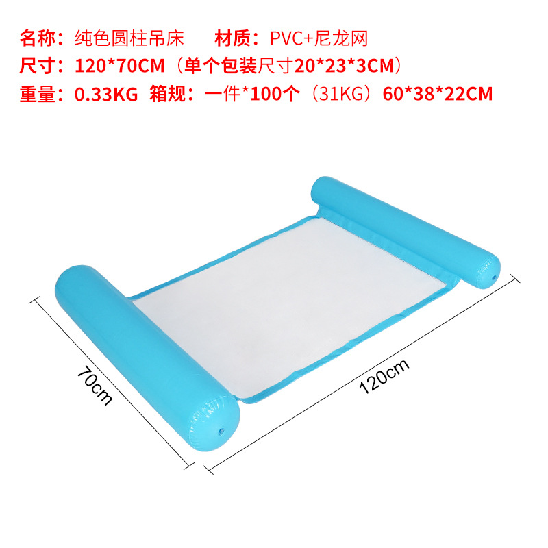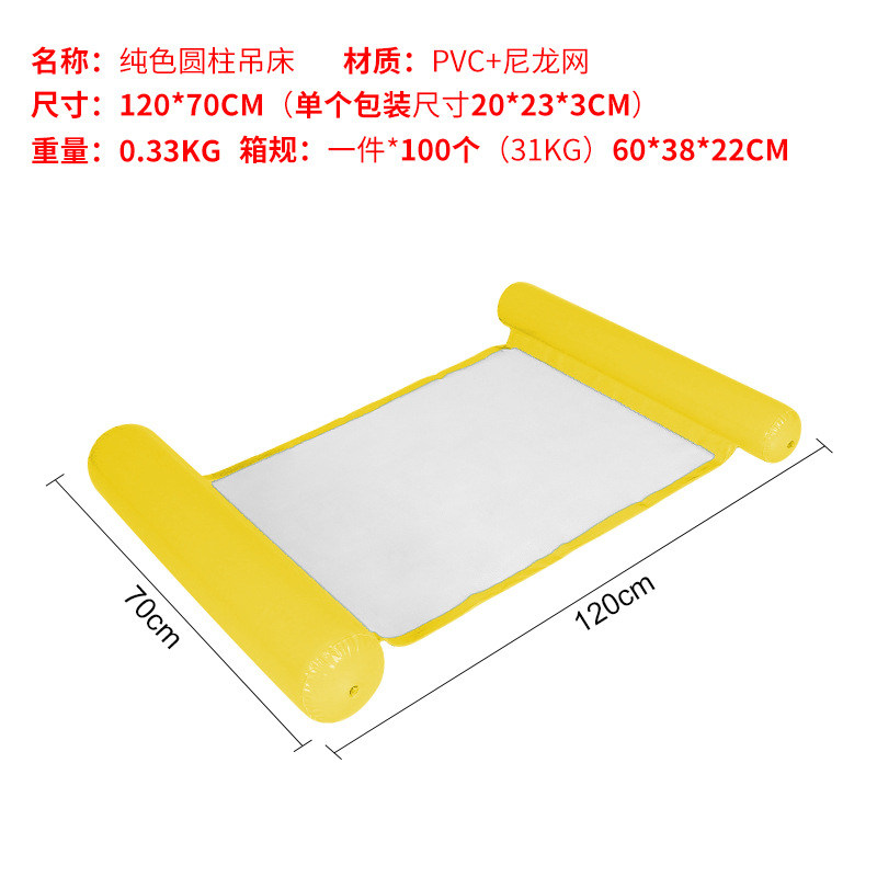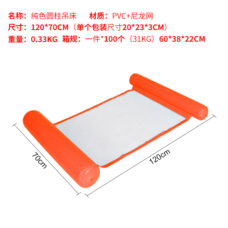 NAME|名称:纯色吊床浮排 SIZE|尺寸:120*73cm PACKING|包装:OPP袋包装+彩卡 WEIGHT|重量:单个0.33KG 整箱34KG PACKAGE SIZE|单个包装尺寸:25*20*2.5CM MATERIAL|材质:PVC+尼龙网 COLOUR|颜色:红色、黄色、橙色、深蓝色、玫红色、浅蓝色 SPEC|箱规:60*38*22CM QUANTITY|装箱数量:100PCS