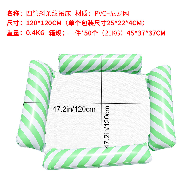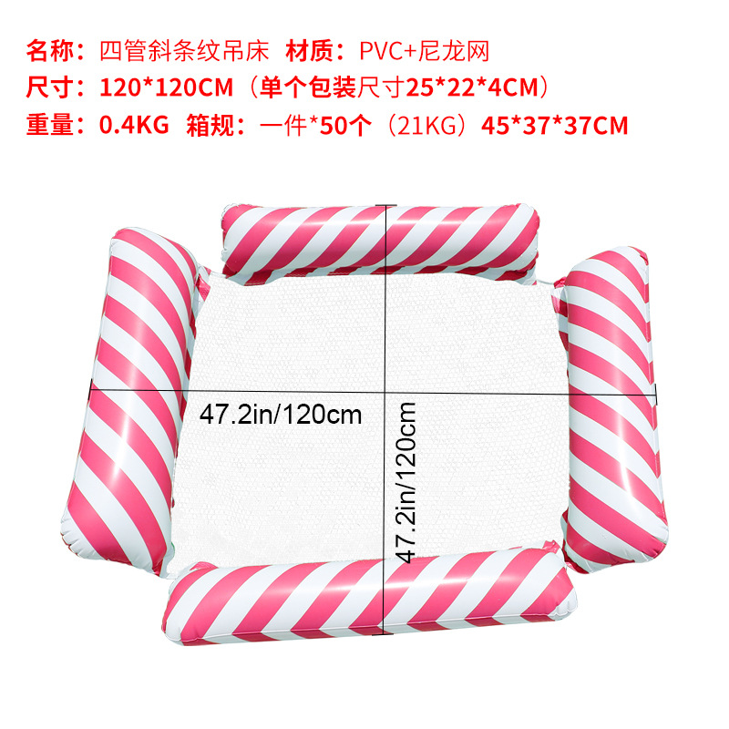 NAME|名称:四管吊床 SIZE|尺寸:122*122cm PACKING|包装:OPP袋包装+彩卡 WEIGHT|重量:单个0.4KG 整箱21KG PACKAGE SIZE|单个包装尺寸:25*22*4CM MATERIAL|材质:PVC+尼龙网 COLOUR|颜色:斜条纹4色:蓝色、绿色、玫红色、黄色 直条纹6色:蓝色、绿色、玫红色、黄色、橘色、深蓝色 SPEC|箱规:45*37*37CM QUANTITY|装箱数量:50PCS