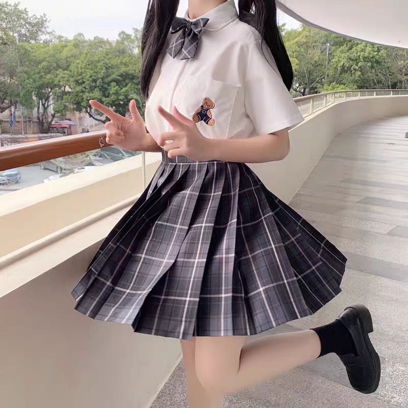Цельная курточная серая клетчатая юбка; Дымчато-серая клетчатая юбка + галстук-боксер; Сモкингово-серая клетчатая юбка + свободная рубашка с короткими рукавами + галстук-боксер.; Дымчато-серая клетчатая юбка + свободная рубашка с длинными рукавами + галстук-боксер.; Дымчато-серая клетчатая юбка + свободная рубашка с короткими рукавами + галстук-боксер + черный короткий костюм на одной пуговице + большой значок Донъяна; Дымчато-серая клетчатая юбка + свободная рубашка с длинными рукавами + галстук-боксер + черный короткий костюм на одной пуговице + большой значок Донъяна