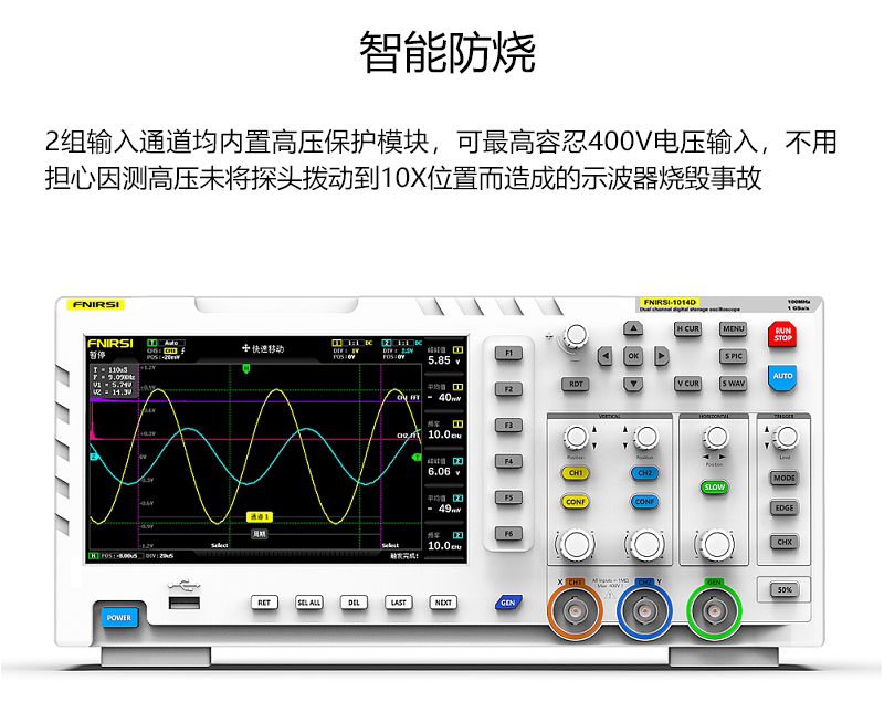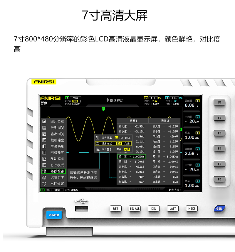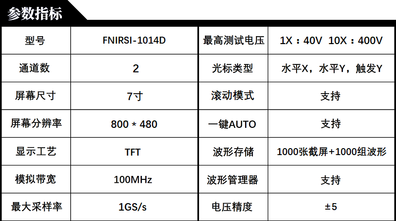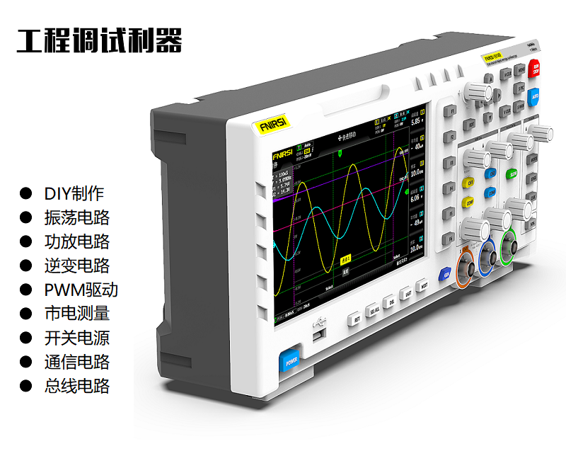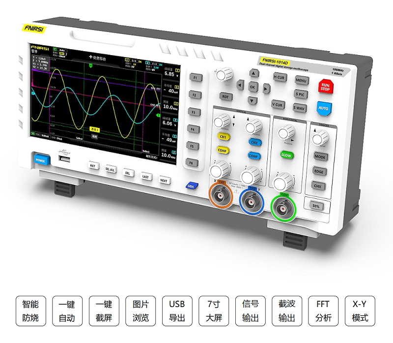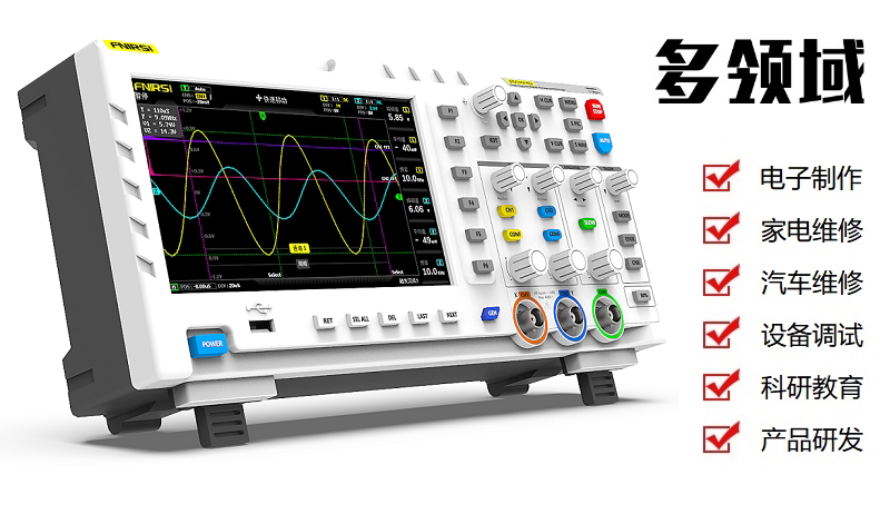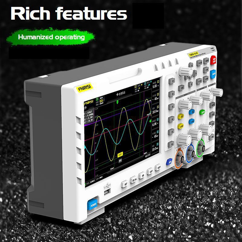 FNIRSI-1014D is a two in one oscilloscope and signal generator launched by FNIRSI. It has comprehensive functions and high practicability. It is a cost-effective dual channel desktop oscilloscope for the maintenance industry and R & D industry. The oscilloscope has a real-time sampling rate of 1GSa / s and 100MHz* 2 analog bandwidth; complete trigger function (single time / normal / automatic), both for periodic analog signal and aperiodic digital signal can be used freely; built in DDS function signal generator and the industry's original chopping output (@ 2.5vpp), all signal frequency step is 1Hz, support 14 kinds of standard function signal and a customizable chopping signal, chopping The output device intercepts part or the whole part of the complex signals measured by the oscilloscope as the output signal of the signal generator, which can store up to 1000 customized cut-off signals; the built-in high-voltage protection module can tolerate up to 400V continuous voltage, without worrying about the oscilloscope burning accident caused by the probe not moving to 10x gear. Large time base scrolling mode, which can monitor slow level changes; equipped with efficient one button auto, which can display the measured waveform without tedious adjustment; display high-definition LCD with 7-inch 800 * 480 resolution; cursor measurement function, when manually reading amplitude and frequency parameters, it does not need to read the background scale unit and quantity, and it does not need to convert to directly get peak to peak and frequency Extremely convenient screen capture and waveform storage function, built-in 1GB storage space, can store up to 1000 screen capture pictures + 1000 groups of waveform data, the storage process is simple and fast, save the current waveform with only one click, no cumbersome prompts and choices to save the current data, very convenient; powerful waveform image manager, support thumbnail browsing, view, view details The functions of page turning, deleting and waveform enlarging, reducing and moving are convenient for secondary analysis. The fuselage is equipped with USB interface, which can be connected with the computer to realize the sharing of its own screen capture pictures and the computer, which is convenient for secondary analysis; Li Shayu's graphic display function can be used to compare and judge the amplitude, frequency and phase of two groups of signals; FFT viewing function can estimate the harmonic component of signals; Li Shayu's graphic display function can be used to compare and judge the amplitude, frequency and phase of two groups of signals;
