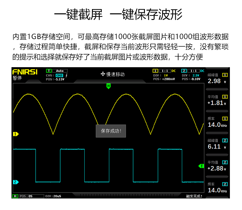 14:Built-in 1GB storage space, can store up to 1000 screenshots + 1000 sets of waveform data