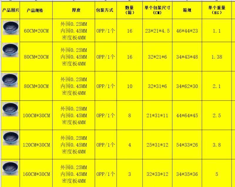 30*10cm; 50*8cm; 60*20cm; 80*20cm; 80*30cm; 100*30cm; 120*30cm; 160*30cm
