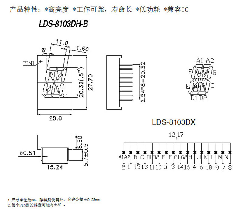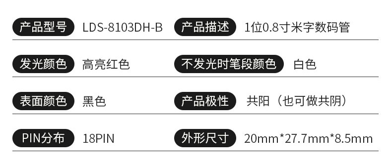 Производитель имеет в наличии 1-битную 0,8-дюймовую цифровую трубку с красным светодиодом и общим катодом. Размеры 20*27,7*8,5.