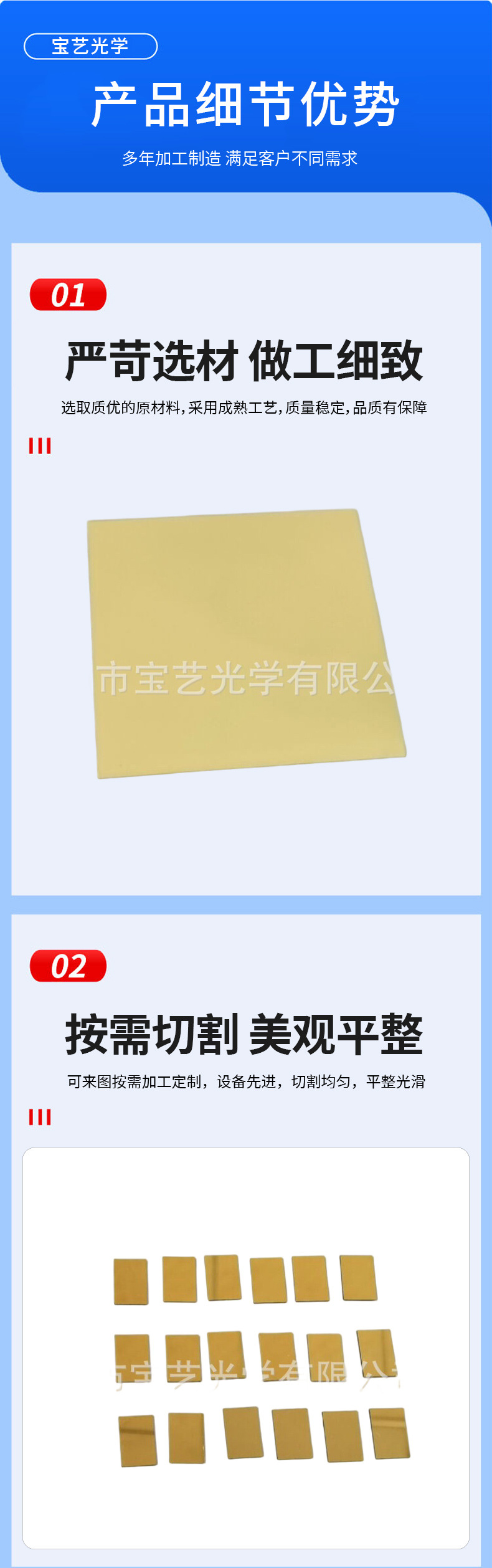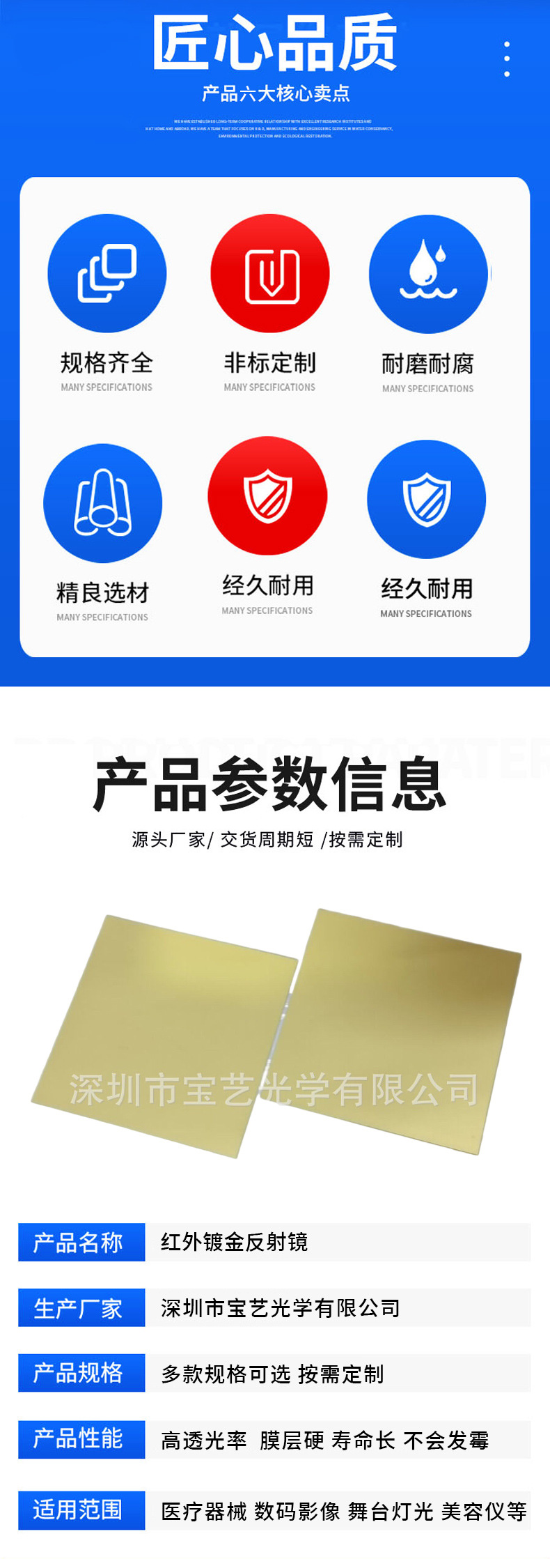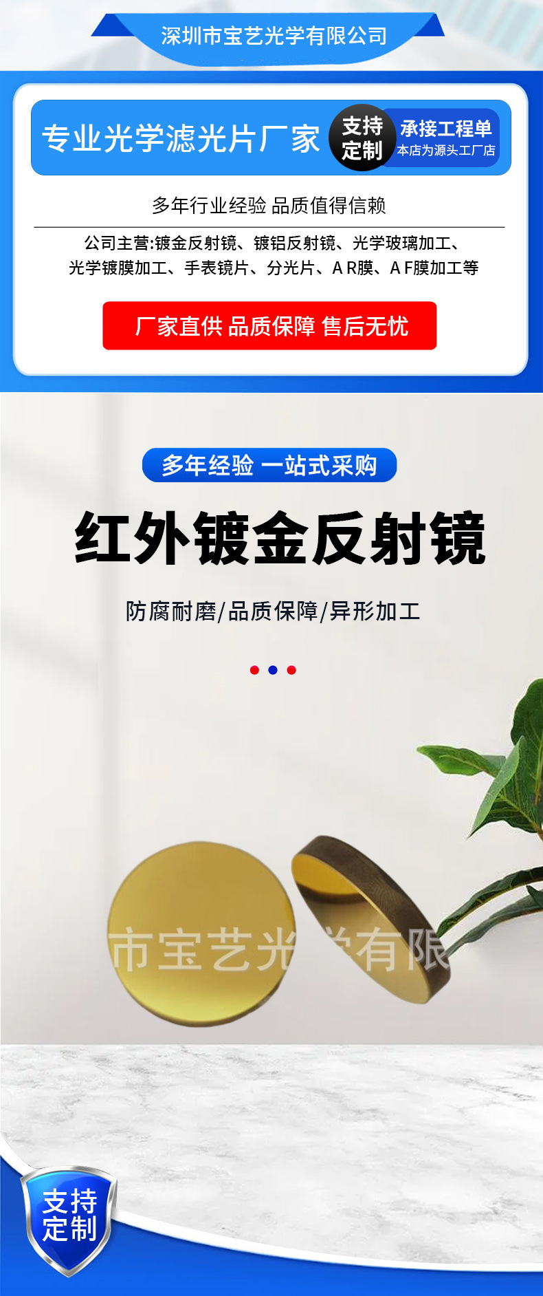 Производитель поставляет золотисто-покрытые отражатели дальнего инфракрасного диапазона, оптические линзы, алюминиево-серебряные отражатели, защитное стекло и светофильтрующие линзы.