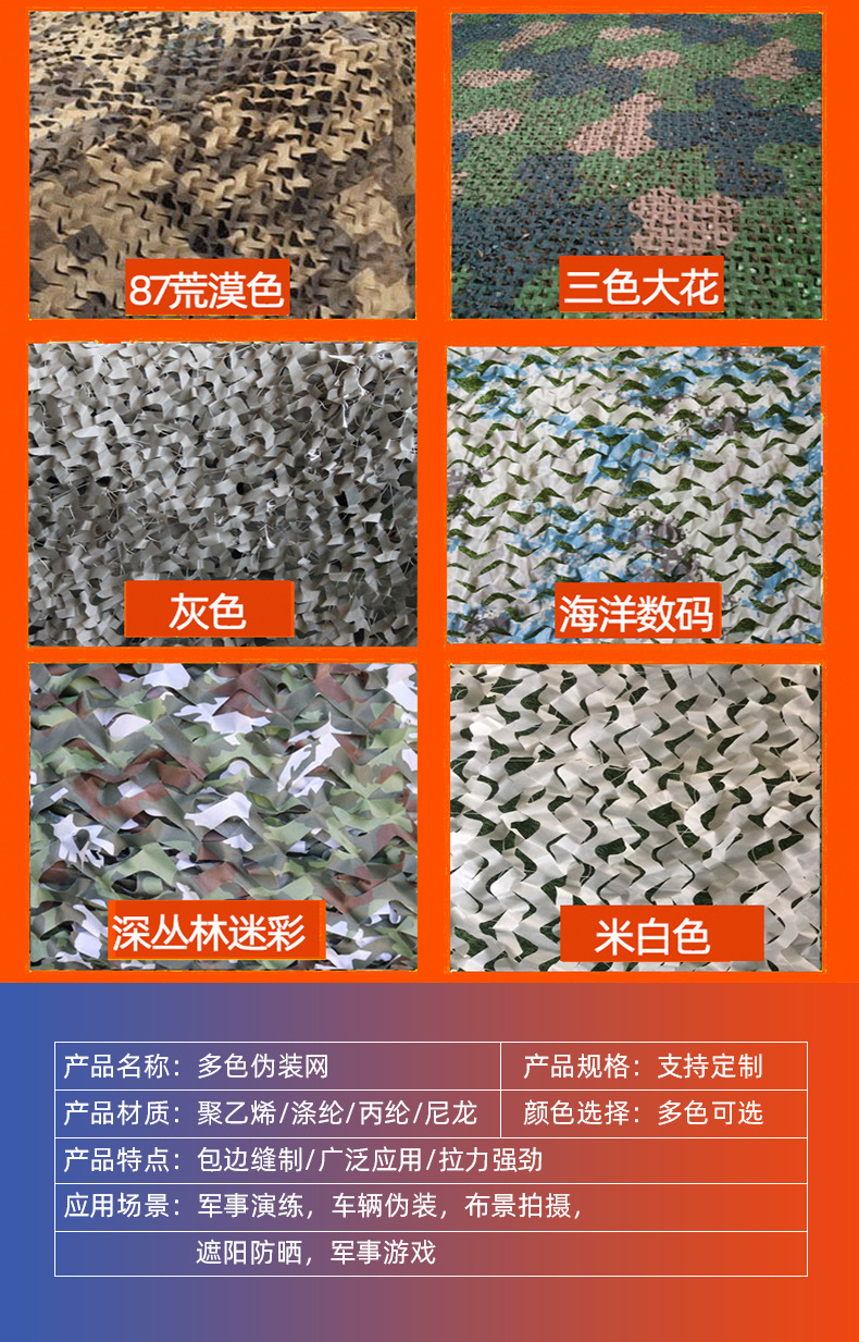 Камуфляж джунглей; Пустыня камуфляж; Цифровой камуфляж; Океан камуфляж; Сплошной камуфляж; Снежный камуфляж