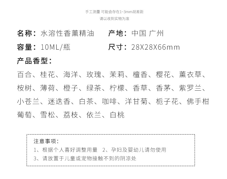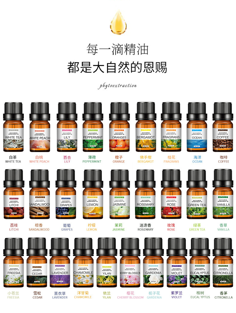 лаванда; роза; море; Цветение вишни; сандаловое дерево; османтус; жасмин; лилия; мята; оранжевый; зеленый чай; лимон; ваниль; фиолетовый; цитронелла; эвкалипт; фрезия; розмарин; белый чай; кофе; ромашка; Гардения; бергамот; виноград; кедр; личи; Иланг; белый персик; Набор из 6 водорастворимых эфирных масел для ароматерапии.; Набор из 12 штук водорастворимого эфирного масла для ароматерапии.
