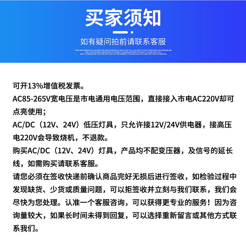 AC/DC(12V、24V)低压灯具,只允许接12V/24V供电器,接高压电220V会导致烧机,拒绝退款。购买AC/DC(12V、24V)灯具,产品均不配变压器,及信号的延长线,如需购买请联系客服。