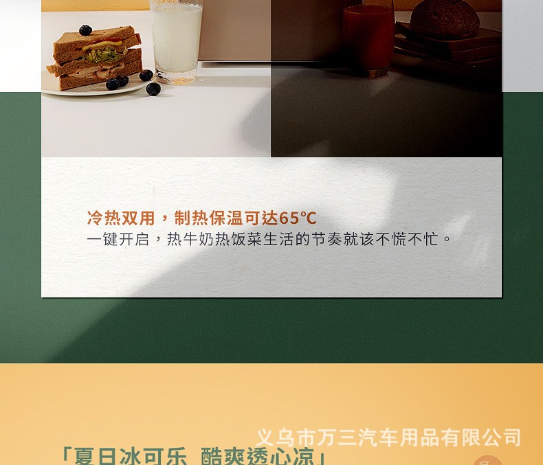 【车载冰箱适用范围】:半导体制冷款:适用于饮料、食物、水果、化妆品、牛奶的保鲜储存及保温。单核不能放肉类,不能冷冻。