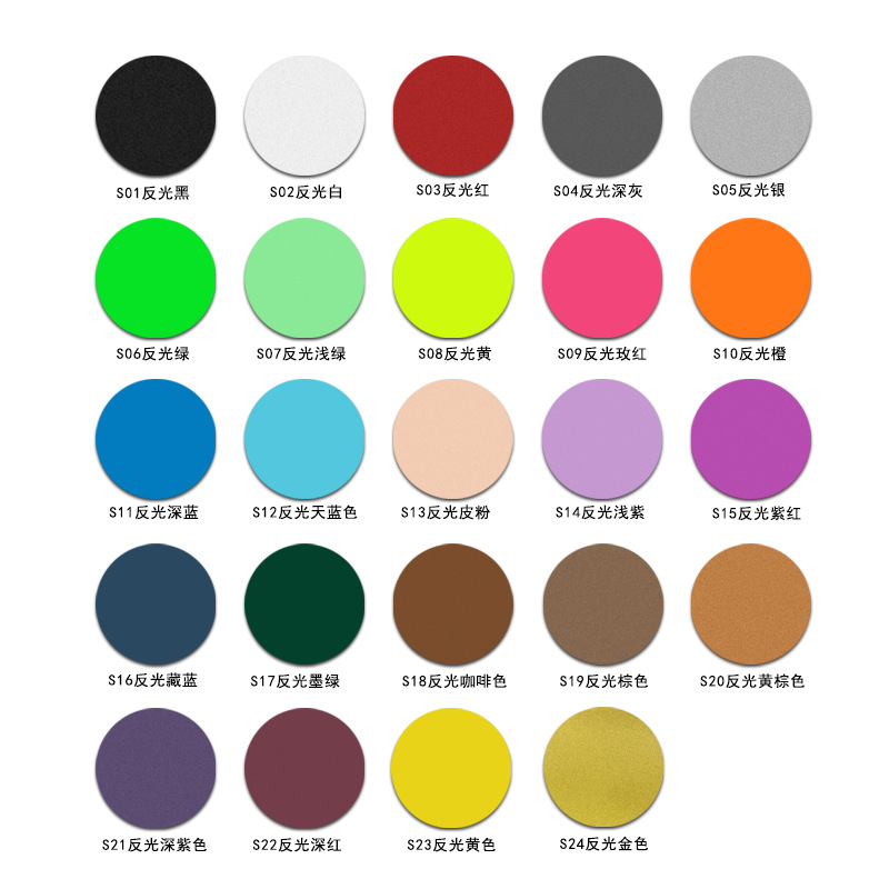 S01 светоотражающий черный; S02 светоотражающий белый; S03 светоотражающий красный; S04 светоотражающий темно-серый; S05 светоотражающий серебристый; S06 светоотражающий зеленый; S07 светоотражающий светло-зеленый; S08 светоотражающий флуоресцентный желтый; S09 светоотражающая розово-красная; S10 светоотражающий оранжевый; S11 светоотражающий темно-синий; S12 светоотражающий небесно-голубой; Светоотражающий кожаный порошок S13; S14 светоотражающий светло-фиолетовый; S15 светоотражающий фиолетовый; S16 светоотражающий темно-синий; S17 светоотражающий темно-зеленый; S18 светоотражающий кофе; S19 светоотражающий коричневый; S20 светоотражающий желто-коричневый; S21 светоотражающий фиолетовый; S22 светоотражающий темно-красный; S23 светоотражающий желтый; S24 светоотражающий золото