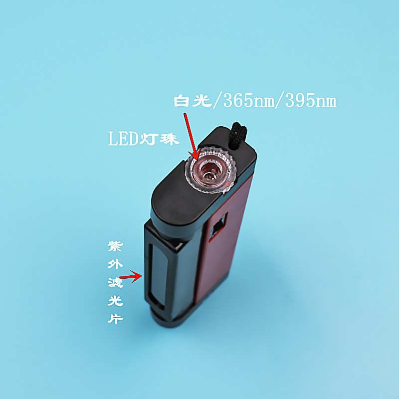 1、用手推开关至TORCH为LED白光照明,推开关至TVBE为365nm长波紫外线荧光灯。