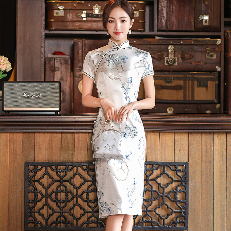 Новое платье-чонсам из атласа с двойной подкладкой, весна/лето 2025 года, в национальном стиле, для женщин больших размеров, стройнящее, для банкетов и выступлений.