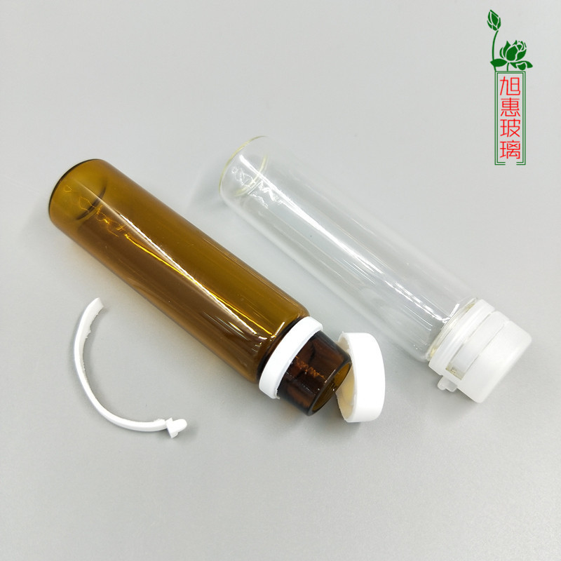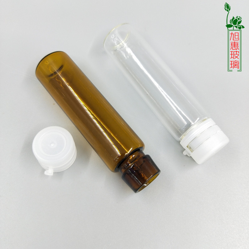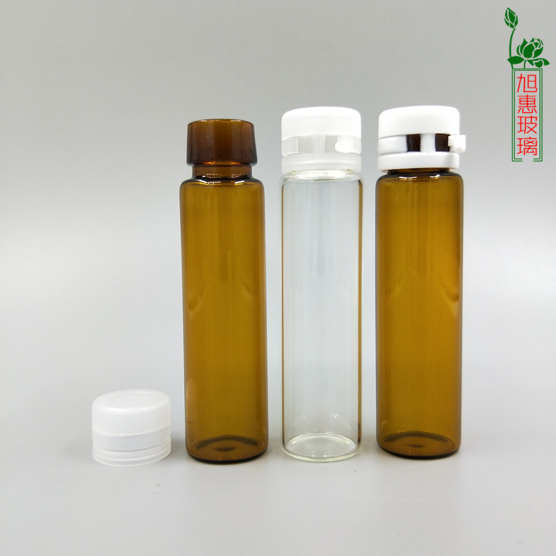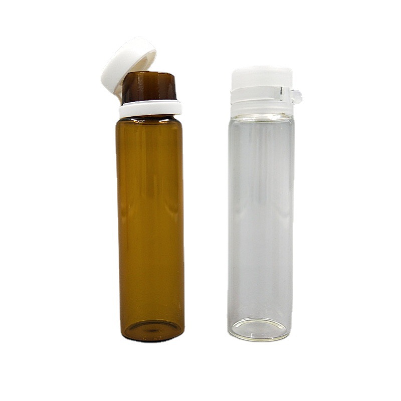 Прозрачная бутылка объемом 10 мл с белой отрывной крышкой.; Коричневая бутылка объемом 10 мл с белой отрывной крышкой.