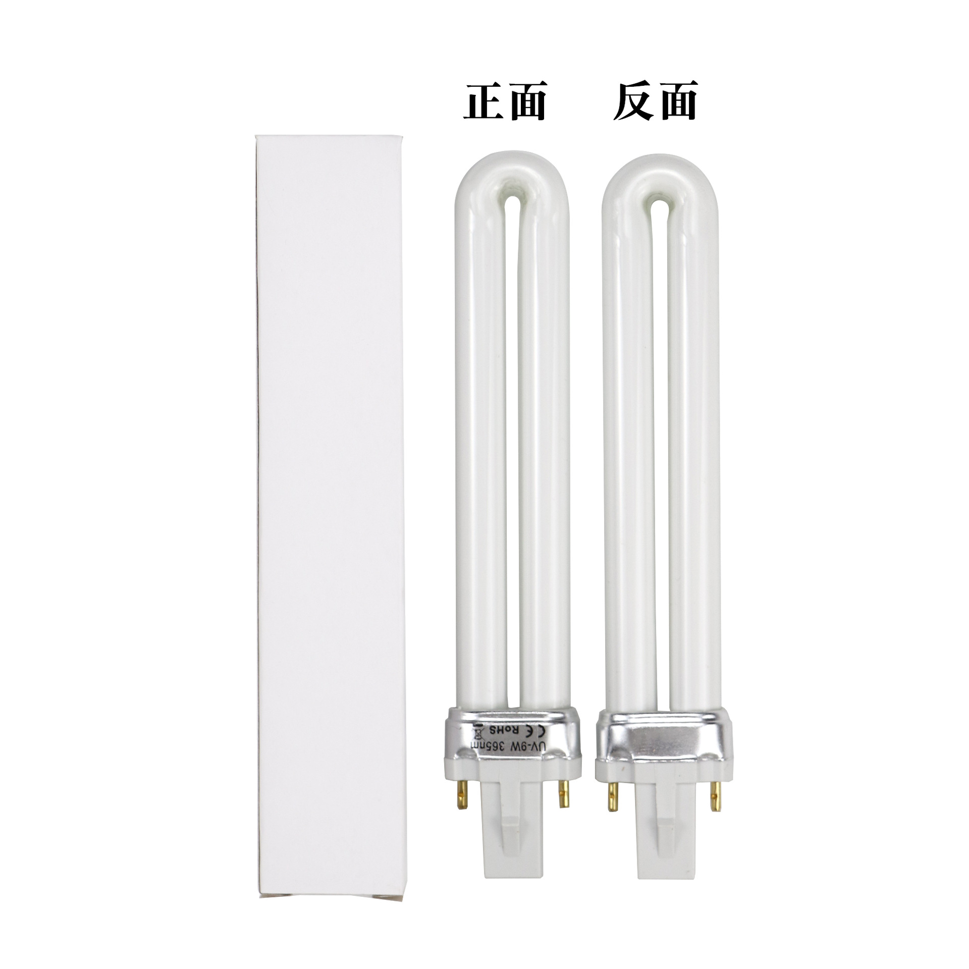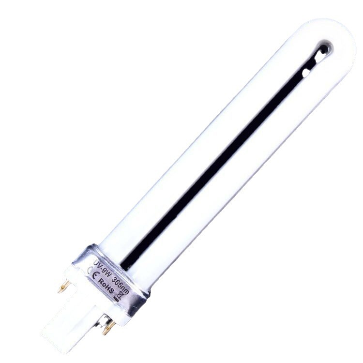 电子灯管的灯:机器电源打开时,灯管直接就亮起来,没有闪烁的过程。 灯管塑料头部分印刷:UV 9w 365nm