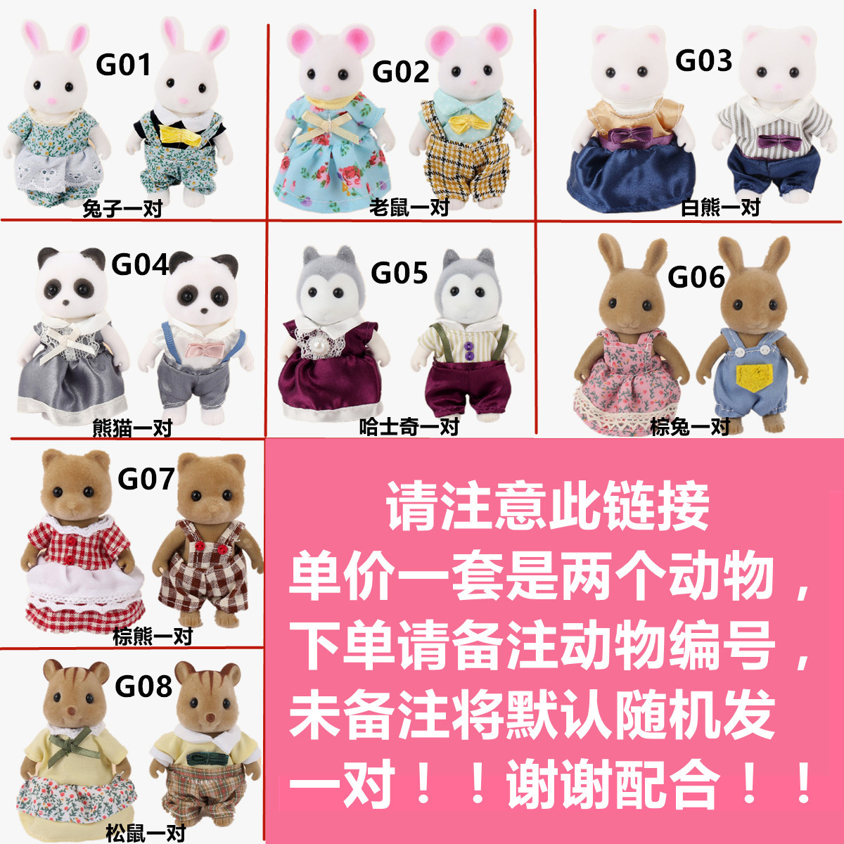 01-S01 Дом/сетки относительно велики, стоимость доставки должна быть рассчитана отдельно.; 03-S03Домик/сетки невелики, стоимость доставки необходимо рассчитывать отдельно.; 04-S04Домик/сетки относительно большие, стоимость доставки необходимо рассчитывать отдельно.; Комнатный комплект 05-T01; 06-T02 Тканевый комплект для гостиной; 07-T03 комплект для ванной комнаты; 08-T04 кухонный гарнитур; 09-T07 комплект для ванной комнаты в твердом переплете; 10-T08 кухонный гарнитур в твердом переплете; 11-T09 Фермерский набор в твердом переплете; Комплект для гостиной в твердом переплете 12-T10; Комплект обеденного стола 13-B01; 14-T06 спальня-кролик; Набор цветочных виноградных лоз 15-B15; 16-В04 пищевой набор; 17-B05 спальный комплект 1; 18-B06 спальный комплект 2; 19-A05 двухслойный домашний костюм/сетки относительно большие, стоимость доставки должна быть рассчитана отдельно.; Двухслойный домашний костюм для ресторана 20-A06 относительно большие сетки, и стоимость доставки необходимо рассчитать отдельно.; 21-B09 тканевый комплект для гостиной; 22-B11 Тканевый комплект для гостиной 1; Набор для фермерского дома 23-B12; 24-A07 трехслойный домашний костюм/сетки относительно большие, стоимость доставки необходимо рассчитывать отдельно.; 25-B14 винтажный спальный гарнитур 1; 26-A08 Light HouseКостюм/сетки относительно большие, стоимость доставки должна быть рассчитана отдельно; 27-A09 очень большой трехслойный светильник HouseКостюм/сетки относительно велики, и стоимость доставки необходимо рассчитать отдельно.; 28-различные наборы кроликов, пожалуйста, обратите внимание на номер при размещении заказа.; 29-G05 Хаски пара; Пасторальная пара мышей 30-G11; 32-G05-1 Семья хаски; 33-G07 Семейство медведя-коричневого цвета; 34-G08 Семейство белка; 35-G09 пара кошек с кленовым листом; Пара свадебных кроликов 36-G10; 38-G03-1 Семейство белого медведя; 39-G06-1 Семейство коричневого кролика; 41-G01-1 Семейство белого кролика; Комплект вертикальных стиральных машин B10; Набор барабанных стиральных машин D07; Школьный автобус C01; Квадроцикл C02; Мотоцикл D01; D02 Десертная тележка; B07-комплект для спальни; B02-Кухонный набор; B03-Кухонный набор; B13-спальный гарнитур; B08-комплект для гостиной; Белая мышь H02 1 семья из трех человек; 012 Семейство из трёх белых кроликов; G01 Семейство кроликов из четырех штук (упаковано в пакеты), обратите внимание, какой из них вам нужен.; Семейство свадебных кроликов G10 из четырех; G03 Семейство белого медведя из четырех человек; G05 Хаски семья из четырех человек; G06 Семейство коричневого кролика из четырех человек; G07 Коричневый Медведь Семейство из Четырёх; Семейство белков G08 из четырех; 01 1 пара белых кроликов; 03 1 пара белых медвежьих малышей; 051 пара хаски-малышков; 06 Коричневый кролик 1 пара; 08 Пара белков; 10 пар новинок; 07 Коричневый Медведь Baby 1 пара; 1 лампочка; Крышка шкафа D04; D06 чехол для ванной комнаты