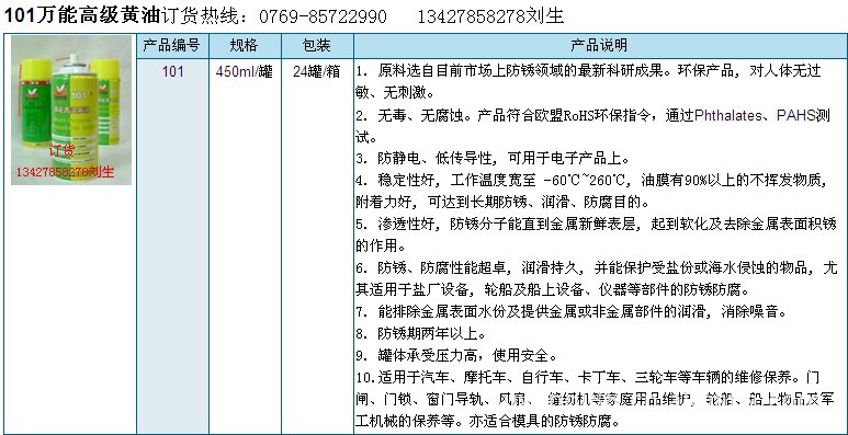 用途:适用于汽车机车,电卷门,精密机械仪器家庭金属运转部之润滑防锈防湿。