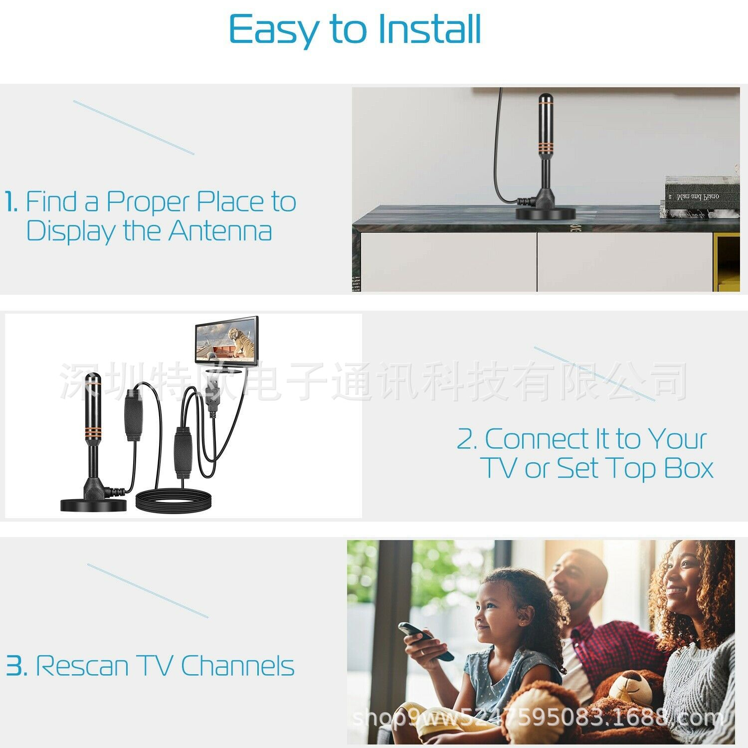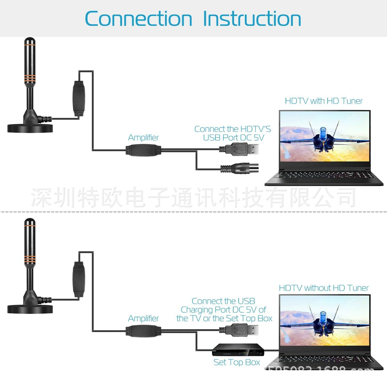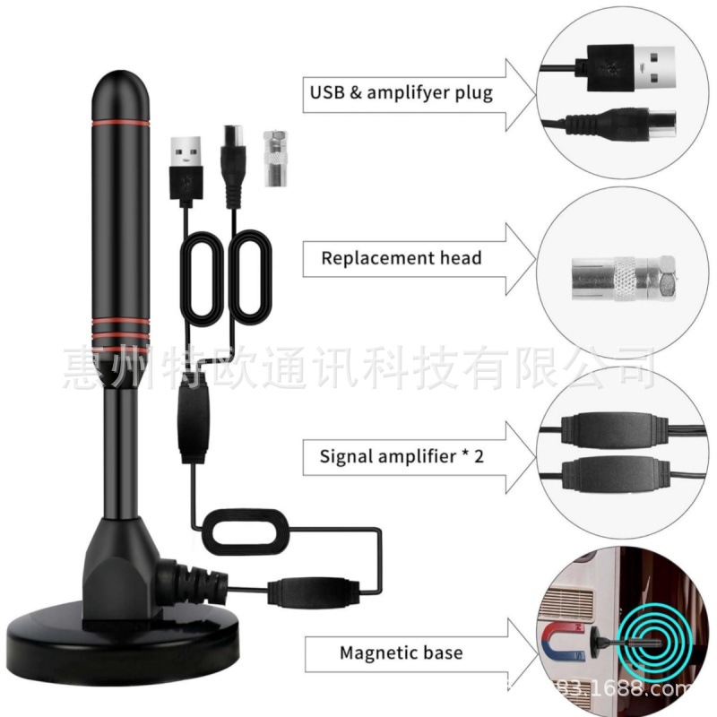 - 采用高增益 37dBi 天线为 HDTV 双放大增强信号。