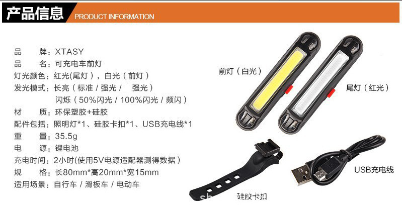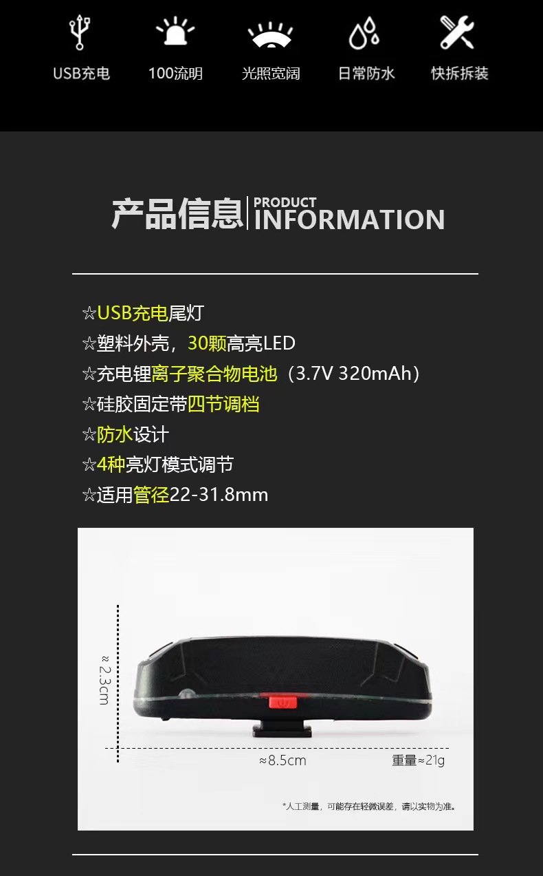 USB充电 亮度100流明 适用安装管径22-31.8mm