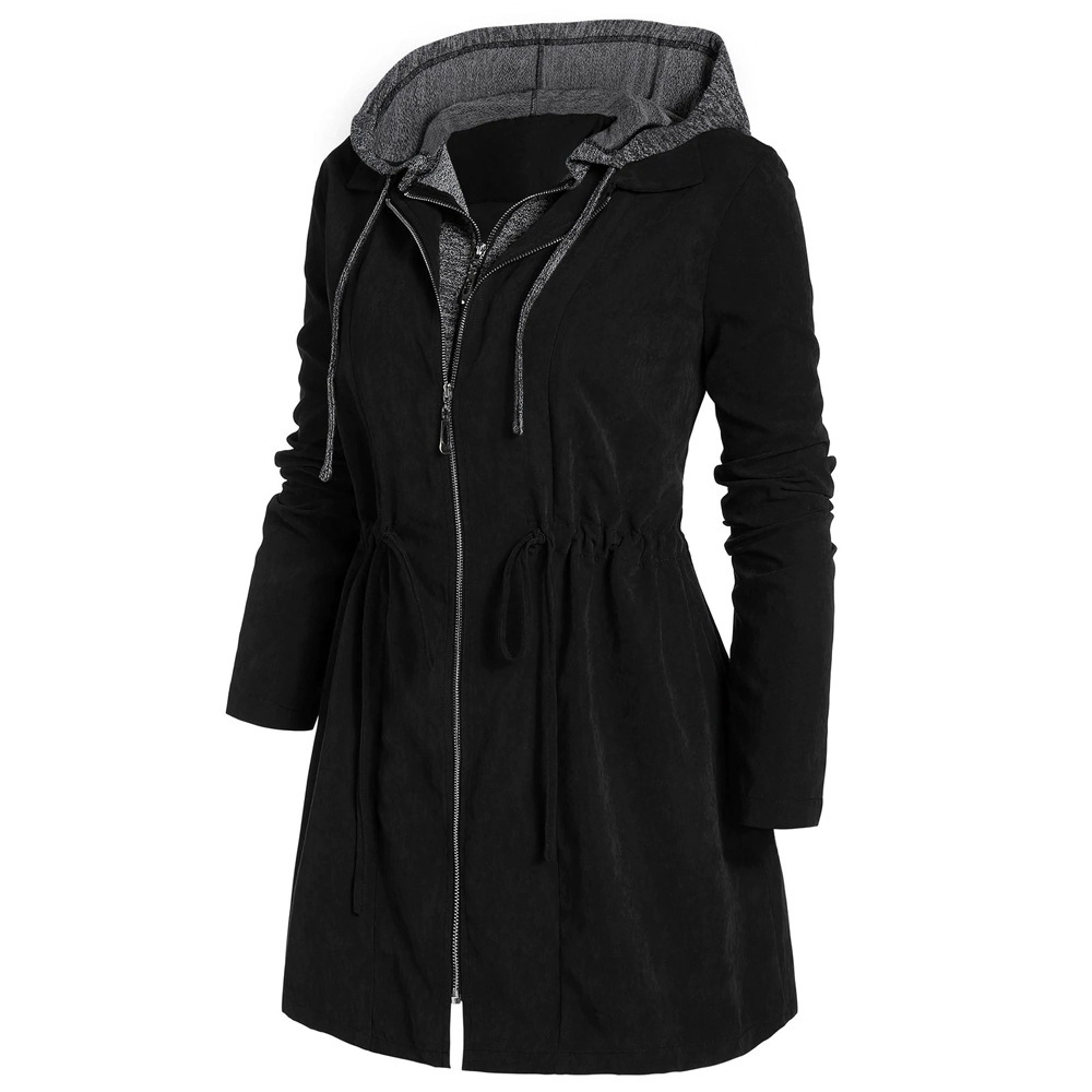Amazon AliExpress длинная женская осенняя и зимняя куртка двухрядная молния поддельные две части с капюшоном большой размер ветровой одежды женский