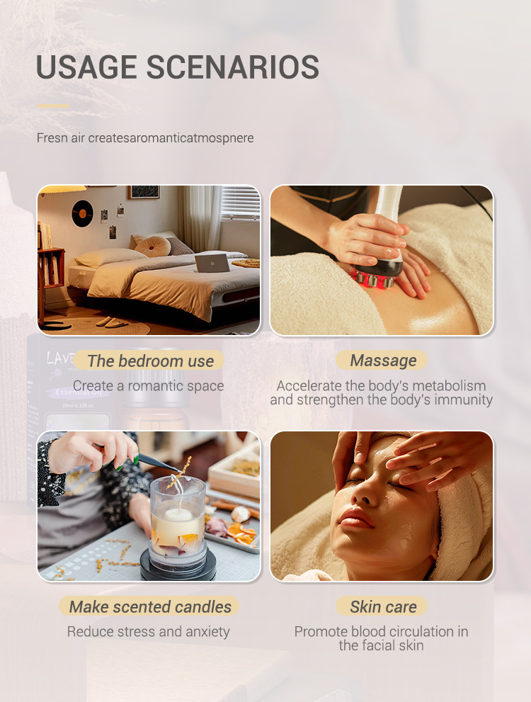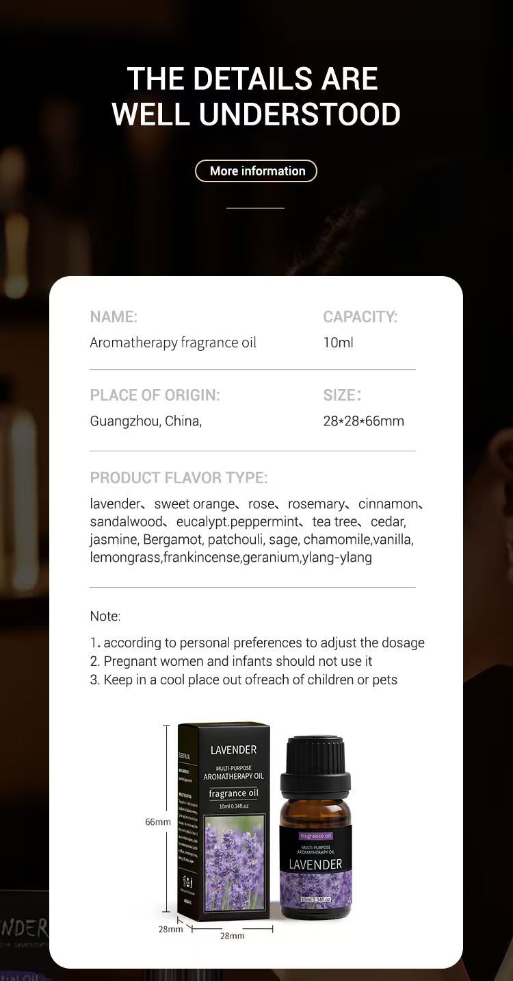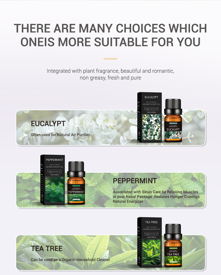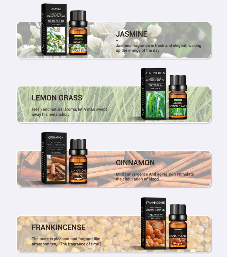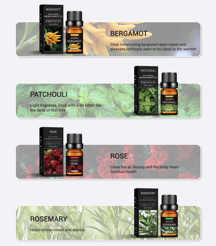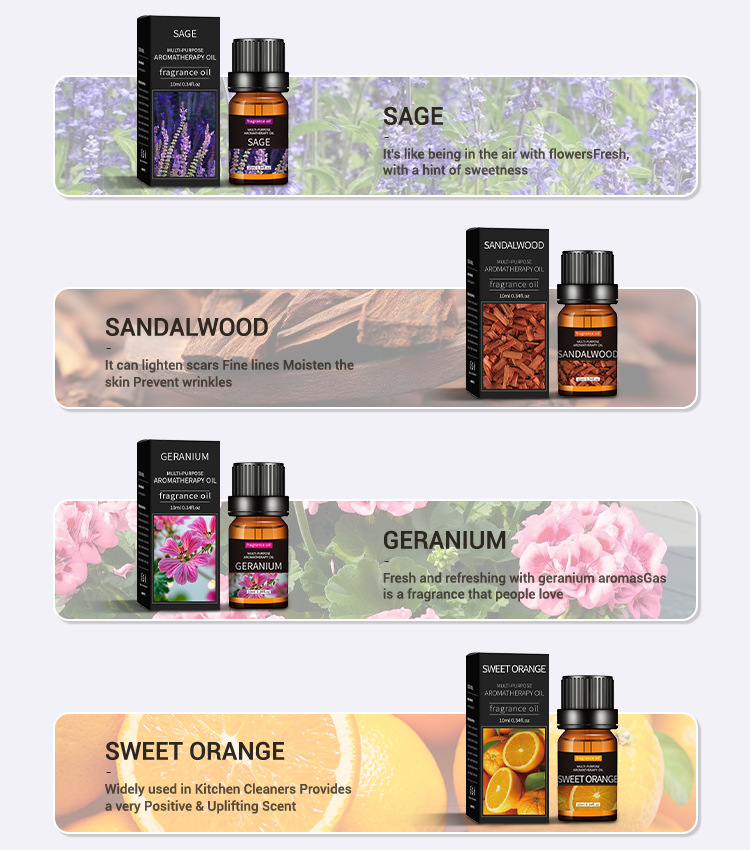 Лаванда (маслянистая); Розмарин (маслянистый); Мята (маслянистая); Роза (маслянистая); Сандаловое дерево (маслянистое); Сладкий апельсин (маслянистый); Чайное дерево (маслянистое); Корица (маслянистая); Эвкалипт (маслянистый); Бергамот (маслянистый); Пачули (маслянистый); Жасмин (маслянистый); Лемонграсс (маслянистый); Ладан (маслянистый); Шалфей (маслянистый); Герань (маслянистая); Ваниль (маслянистая); Кедр (маслянистый); Ромашка (маслянистая); Иланг-иланг (маслянистый)
