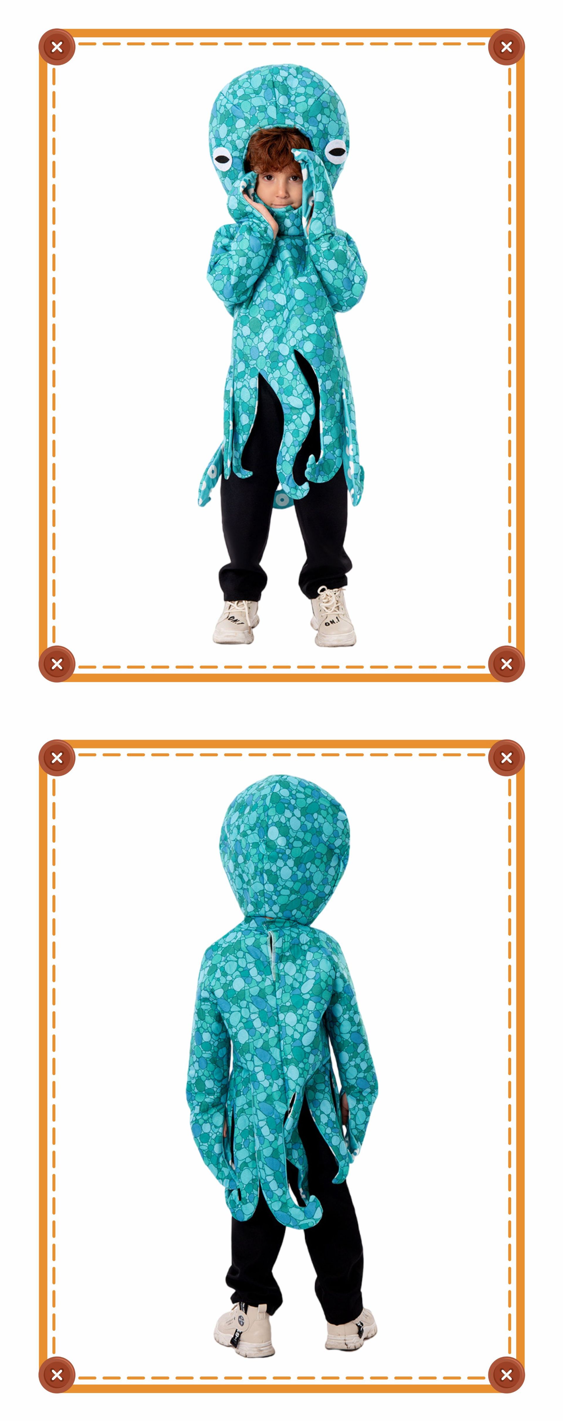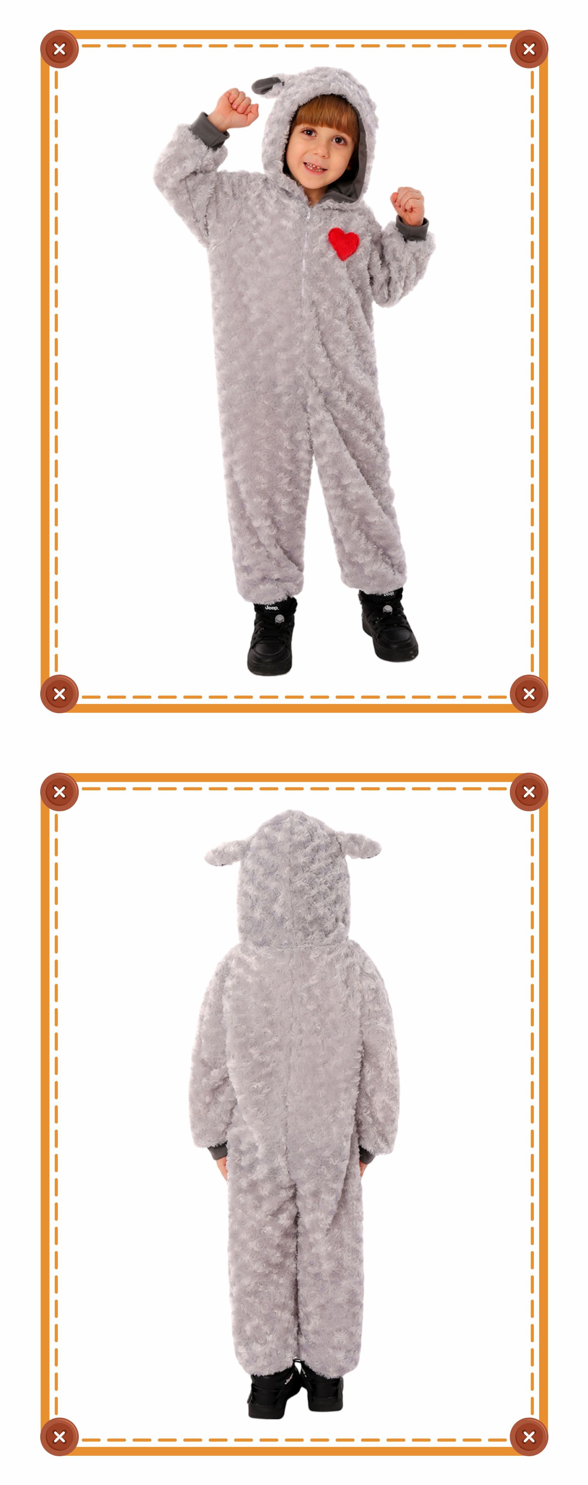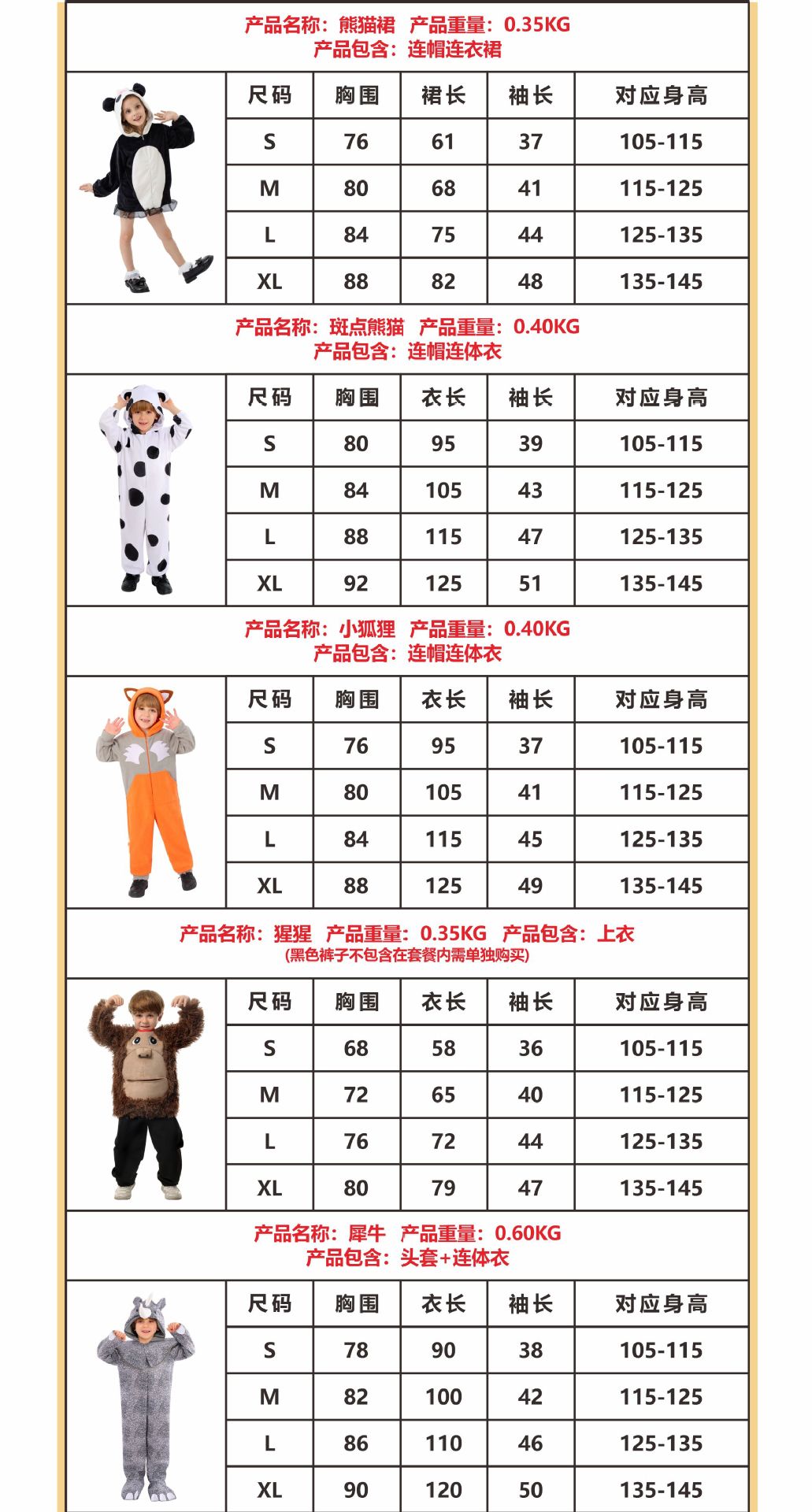 мальчик; овца; белый медведь; леопард; бурый медведь; мышь; коала; носорог; зебра; питон; Кермит, лягушка; дальматинец; горилла; юбка панды; попугай; Тигр; юбка-зебра; фламинго; фламинго синий; улитка; лев; сова; маленькая утка; пингвин; Серая газовая юбка кролика; Комбинезон с пасхальным серым кроликом; девушка-акула; парень-акула; рот акулы; дельфин; треска; Долли; Осьминог Голубой Океан; Богомол; черный комбинезон; белый комбинезон; штаны маленького зверя