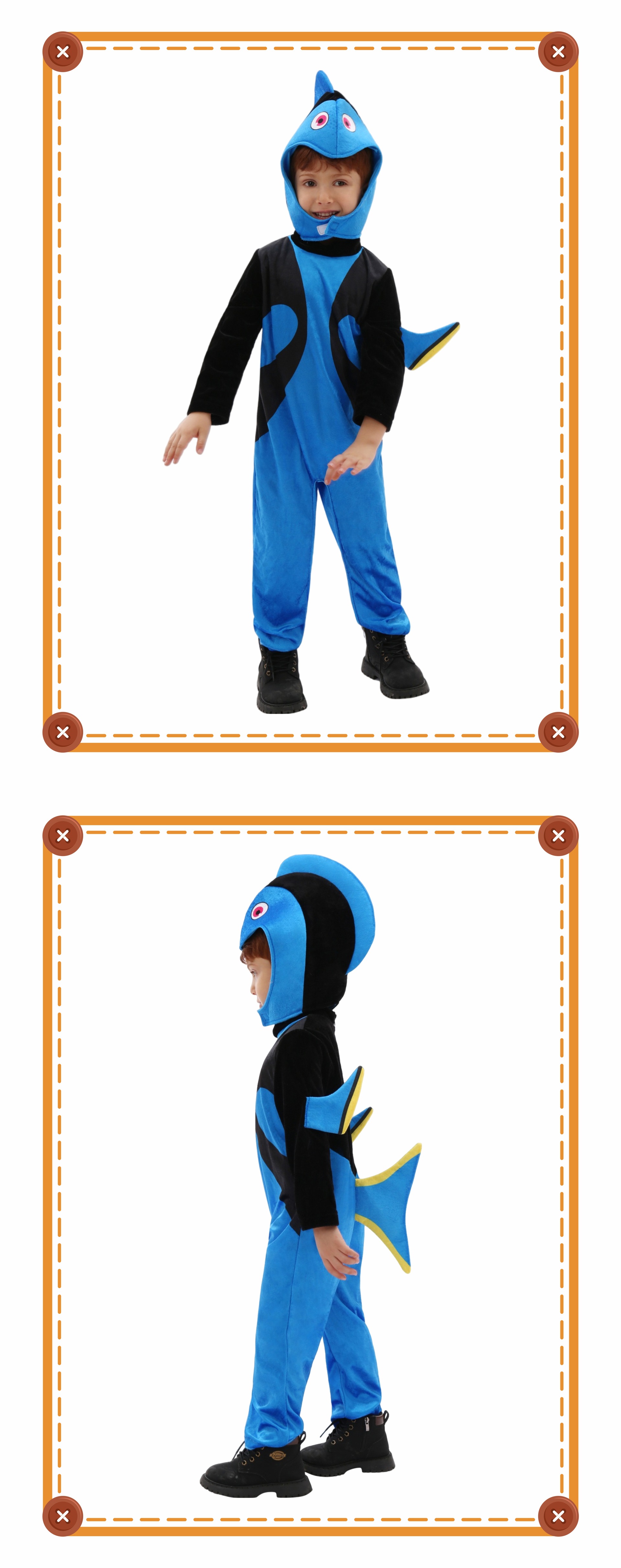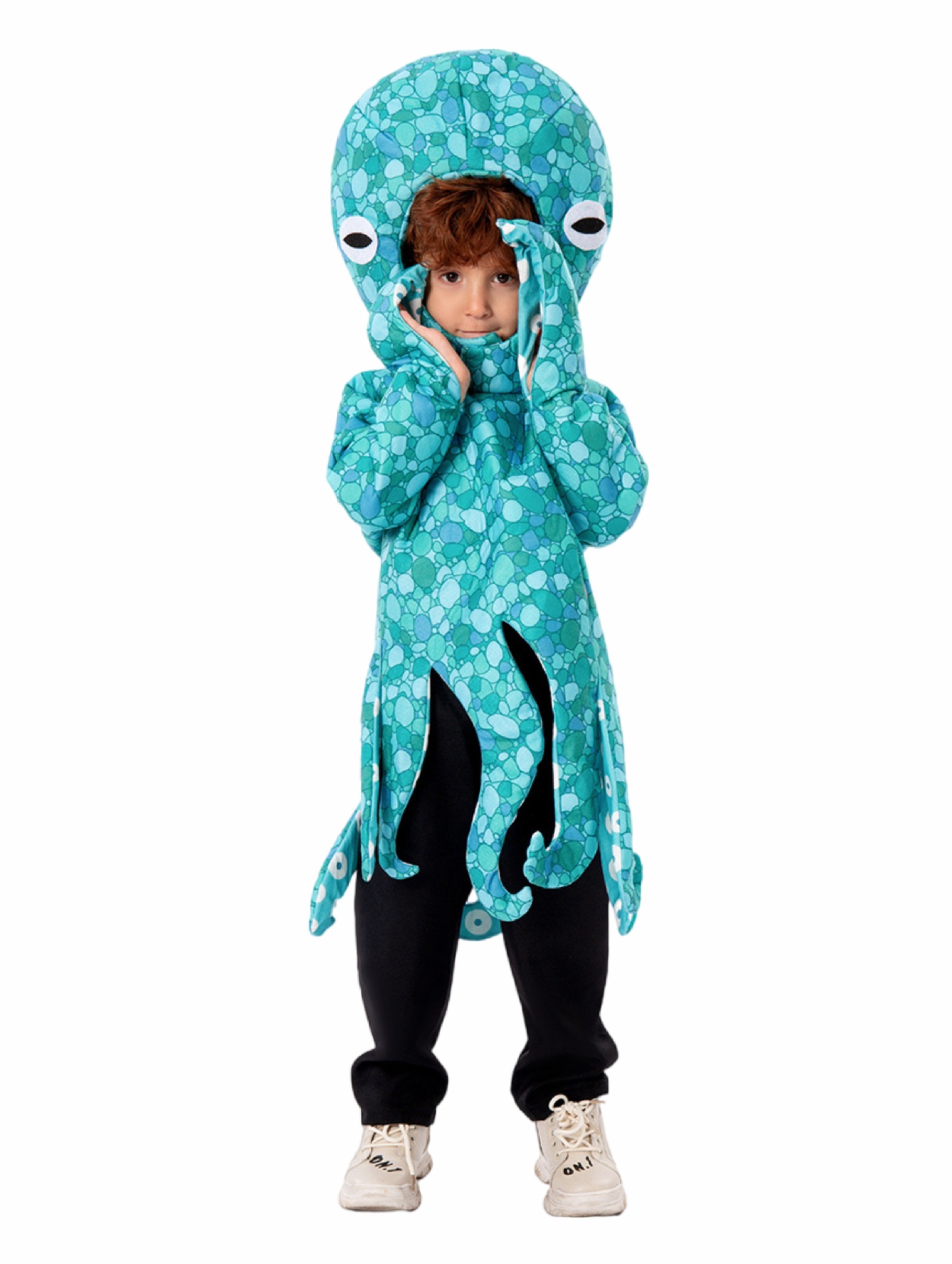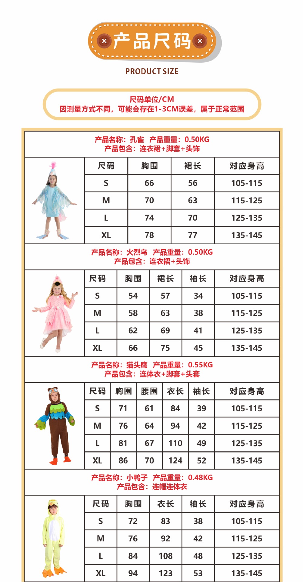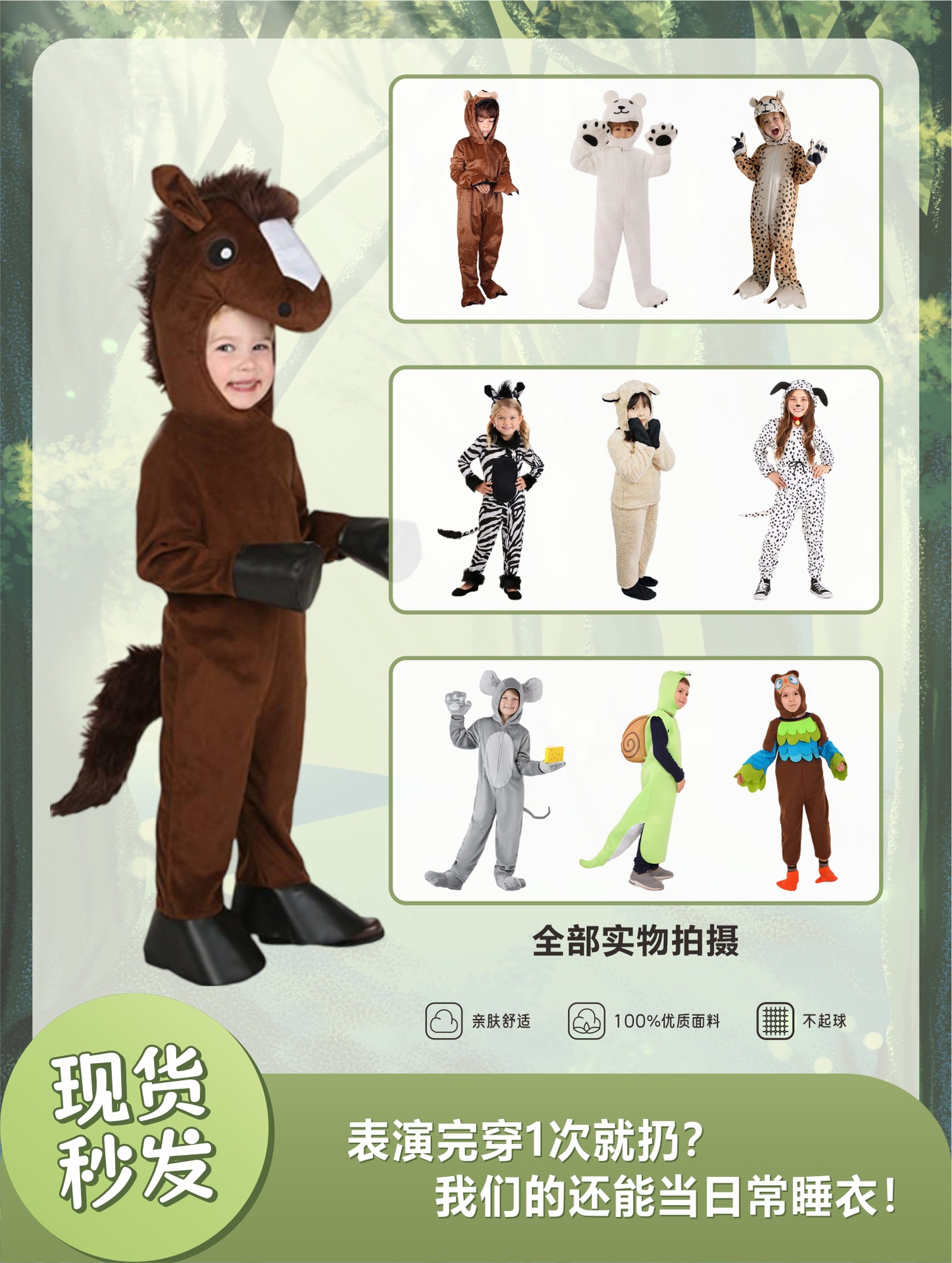 мальчик; овца; белый медведь; леопард; бурый медведь; мышь; коала; носорог; зебра; питон; Кермит, лягушка; дальматинец; горилла; юбка панды; попугай; Тигр; юбка-зебра; фламинго; фламинго синий; улитка; лев; сова; маленькая утка; пингвин; Серая газовая юбка кролика; Комбинезон с пасхальным серым кроликом; девушка-акула; парень-акула; рот акулы; дельфин; треска; Долли; Осьминог Голубой Океан; Богомол; черный комбинезон; белый комбинезон; штаны маленького зверя
