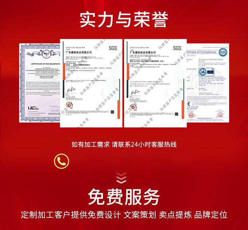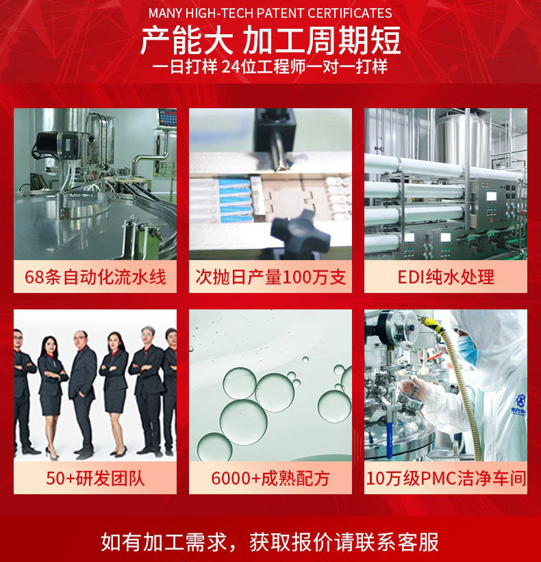 本店所有产品可按照要求定制贴牌,免费打样,免费包装设计,代理备案及送检等,一条龙服务,让您轻松拥有自己的品牌。详情请来电咨询